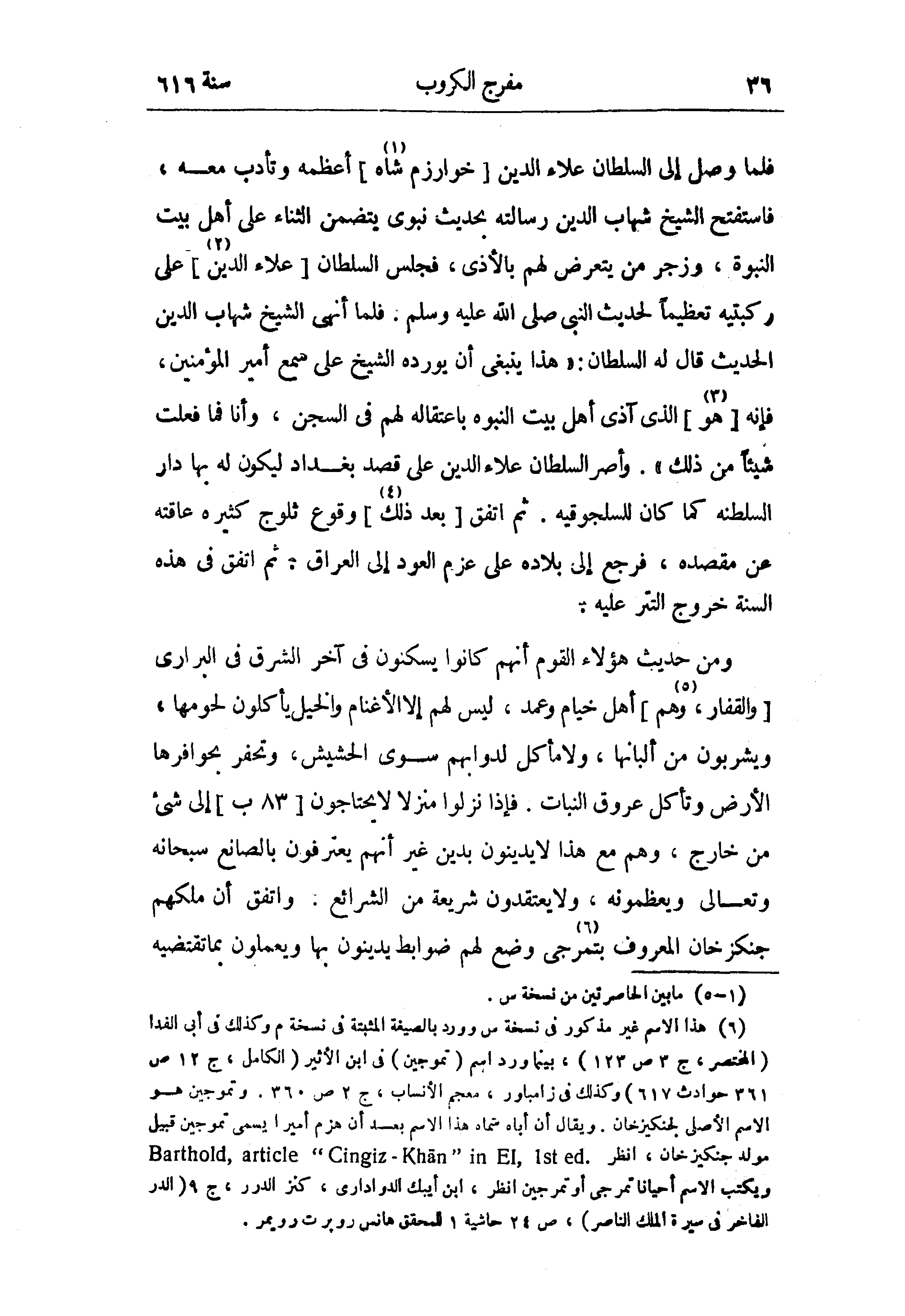 (¬6) هذا الاسم غير مذكور في نسخة س وورد بالصيغة المثبتة في نسخة م وكذلك في أبى الفدأ (المختصر، ج 3 ص 123)، بينما ورد اسم (تموجين) في ابن الأثير (الكامل، ج 12 ص 361 حوادث 617) وكذلك في زامباور، معجم الأنساب، ج 2 ص 360. وتموجين هو الاسم الأصلى لجنكيزخان. ويقال أن أباه شماه هذا الاسم بعد أن هزم أميرا يسمى تموجين قبيل مولد جنكيزخان، انظر Barthold, article «Cingiz - Khan» in EI,1 st ed