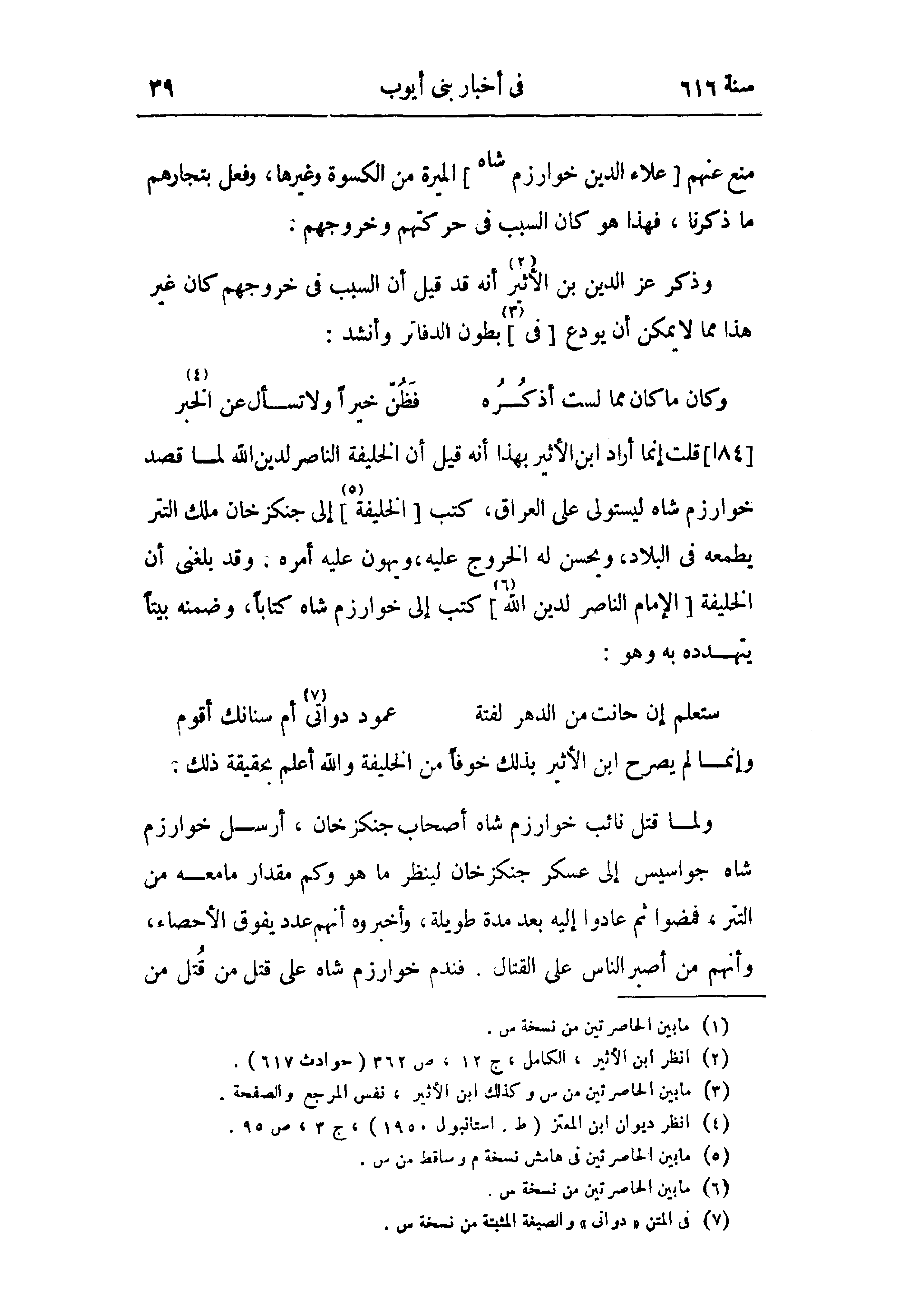 [84 ا] قلت إنما أراد ابن الأثير بهذا أنه قيل أن الخليفة الناصر لدين الله لما قصد خوارزم شاه ليستولى على العراق، كتب [الخليفة (¬5)] إلى جنكزخان ملك التتر يطمعه في البلاد، ويحسن له الخروج عليه، ويهون عليه أمره. وقد بلغنى أن الخليفة [الإمام الناصر لدين الله (¬6)] كتب إلى خوارزم شاه كتابا، وضمنه بيتا يتهدده به وهو: