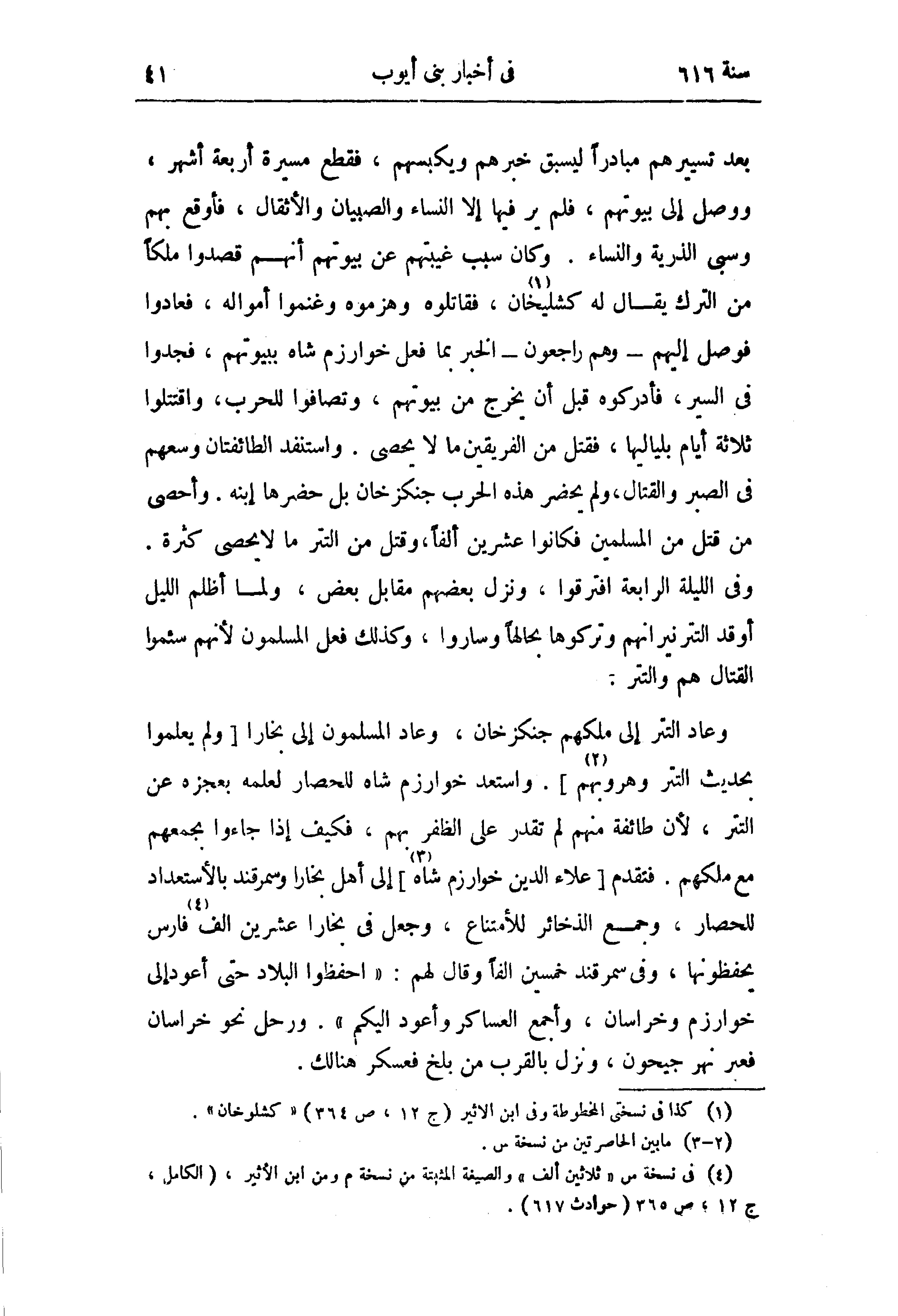 بعد تسييرهم مبادرا ليسبق خبرهم ويكبسهم، فقطع مسيرة أربعة أشهر، ووصل إلى بيوتهم، فلم ير فيها إلا النساء والصبيان والأثقال، فأوقع بهم وسبى الذرية والنساء. وكان سبب غيبتهم عن بيوتهم أنهم قصدوا ملكا من الترك يقال له كشليخان (¬1)، فقاتلوه وهزموه وغنموا أمواله، فعادوا فوصل إليهم - وهم راجعون - الخبر بما فعل خوارزم شاه ببيوتهم، فجدوا في السير، فأدركوه قبل أن يخرج من بيوتهم، وتصافوا للحرب، واقتتلوا ثلاثة أيام بلياليها، فقتل من الفريقين ما لا يحصى. واستنفد الطائفتان وسعهم في الصبر والقتال، ولم يحضر هذه الحرب جنكزخان بل حضرها إبنه. وأحصى من قتل من المسلمين فكانوا عشرين ألفا، وقتل من التتر ما لا يحصى كثرة.