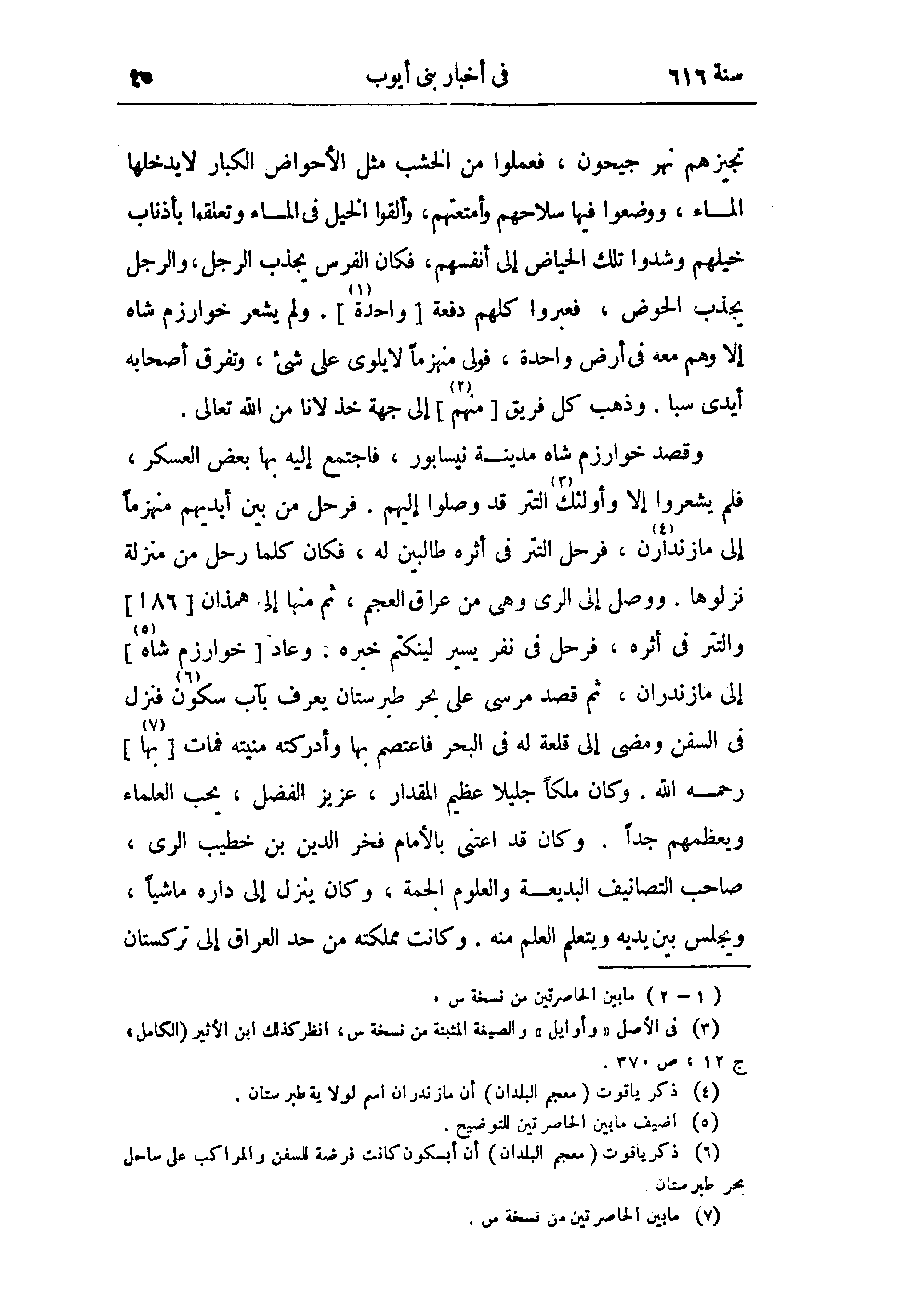 وقصد خوارزم شاه مدينة نيسابور، فاجتمع إليه بها بعض العسكر، فلم يشعروا إلا وأولئك (¬3) التتر قد وصلوا إليهم. فرحل من بين أيديهم منهزما إلى مازندارن (¬4)، فرحل التتر في أثره طالبين له، فكان كلما رحل من منزلة نزلوها. ووصل إلى الرى وهى من عراق العجم، ثم منها إلى همذان [86 ا] والتتر في أثره، فرحل في نفر يسير لينكتم خبره. وعاد [خوارزم شاه (¬5)] إلى مازندران، ثم قصد مرسى على بحر طبرستان يعرف بآب سكون (¬6) فنزل في السفن ومضى إلى قلعة له في البحر فاعتصم بها وأدركته منيته فمات [بها (¬7)] رحمه الله. وكان ملكا جليلا عظيم المقدار، عزيز الفضل، يحب العلماء ويعظمهم جدا. وكان قد اعتنى بالأمام فخر الدين بن خطيب الرى، صاحب التصانيف البديعة والعلوم الجمة، وكان ينزل إلى داره ماشيا، ويجلس بين يديه ويتعلم العلم منه. وكانت مملكته من حد العراق إلى تركستان