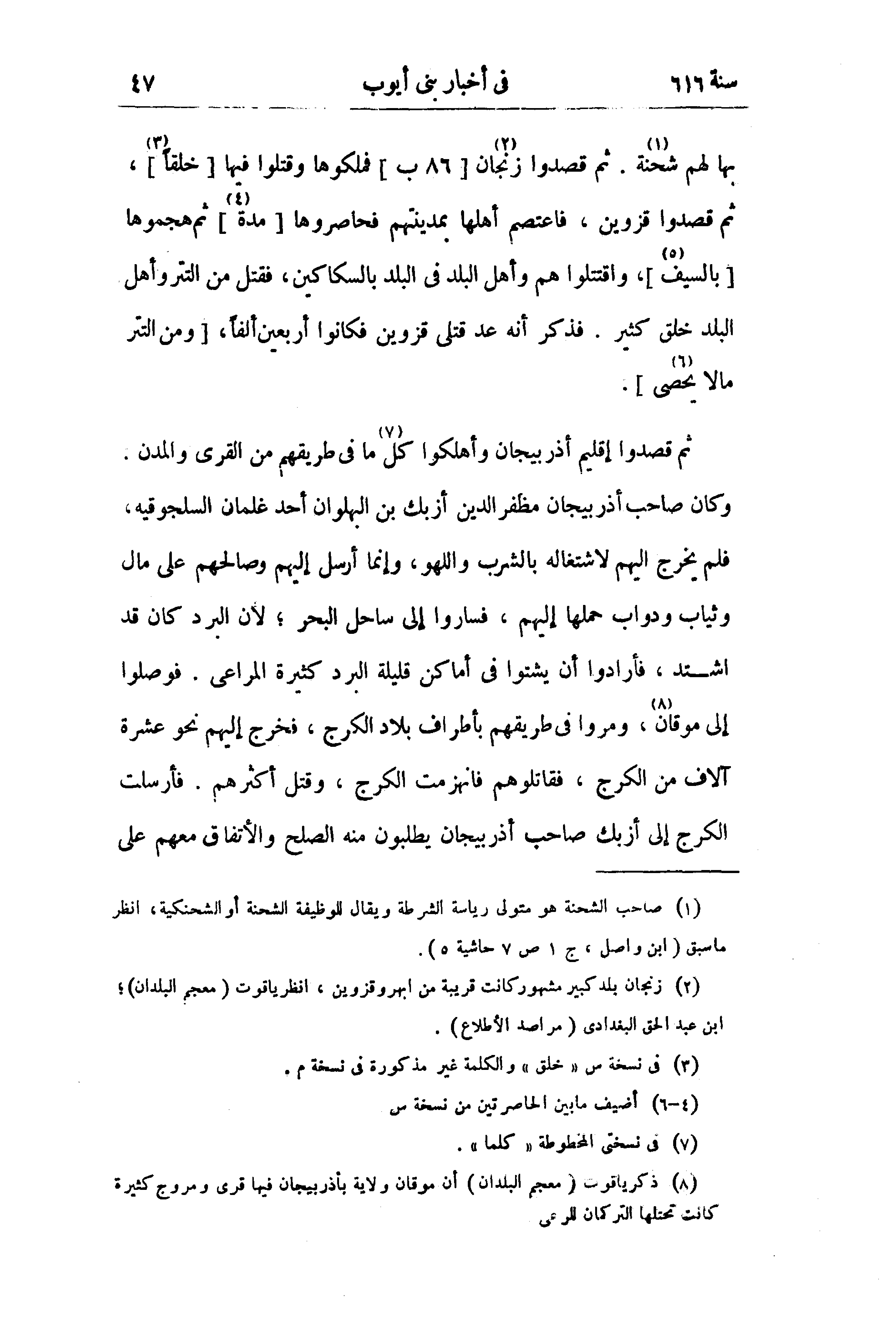 (¬2) زنجان بلد كبير مشهور كانت قريبة من ابهر وقزوين، انظر ياقوت (معجم البلدان)؛ ابن عبد الحق البغدادى (مراصد الأطلاع).