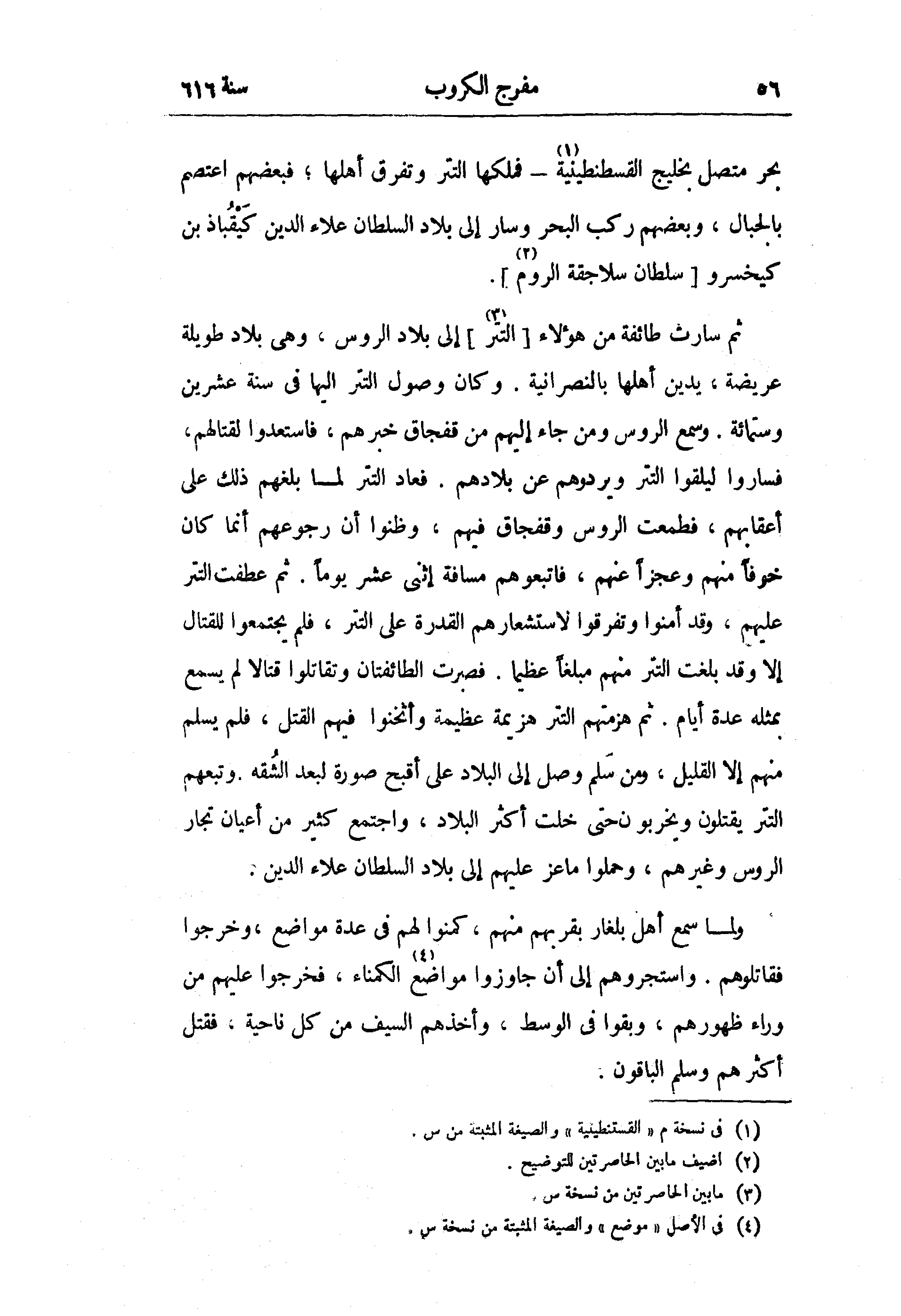 ثم سارت طائفة من هؤلاء [التتر (¬3)] إلى بلاد الروس، وهى بلاد طويلة عريضة، يدين أهلها بالنصرانية. وكان وصول التتر اليها في سنة عشرين وستمائة. وسمع الروس ومن جاء إليهم من قفجاق خبرهم، فاستعدوا لقتالهم، فساروا ليلقوا التتر ويردوهم عن بلادهم. فعاد التتر لما بلغهم ذلك على أعقابهم، فطمعت الروس وقفجاق فيهم، وظنوا أن رجوعهم أنما كان خوفا منهم وعجزا عنهم، فاتبعوهم مسافة إثنى عشر يوما. ثم عطفت التتر عليهم، وقد أمنوا وتفرقوا لاستشعارهم القدرة على التتر، فلم يجتمعوا للقتال إلا وقد بلغت التتر منهم مبلغا عظيما. فصبرت الطائفتان وتقاتلوا قتالا لم يسمع بمثله عدة أيام. ثم هزمتهم التتر هزيمة عظيمة وأثخنوا فيهم القتل، فلم يسلم منهم إلا القليل، ومن سلم وصل إلى البلاد على أقبح صورة لبعد الشقه. وتبعهم التتر يقتلون ويخربون حتى خلت أكثر البلاد، واجتمع كثير من أعيان تجار الروس وغيرهم، وحملوا ماعز عليهم إلى بلاد السلطان علاء الدين.