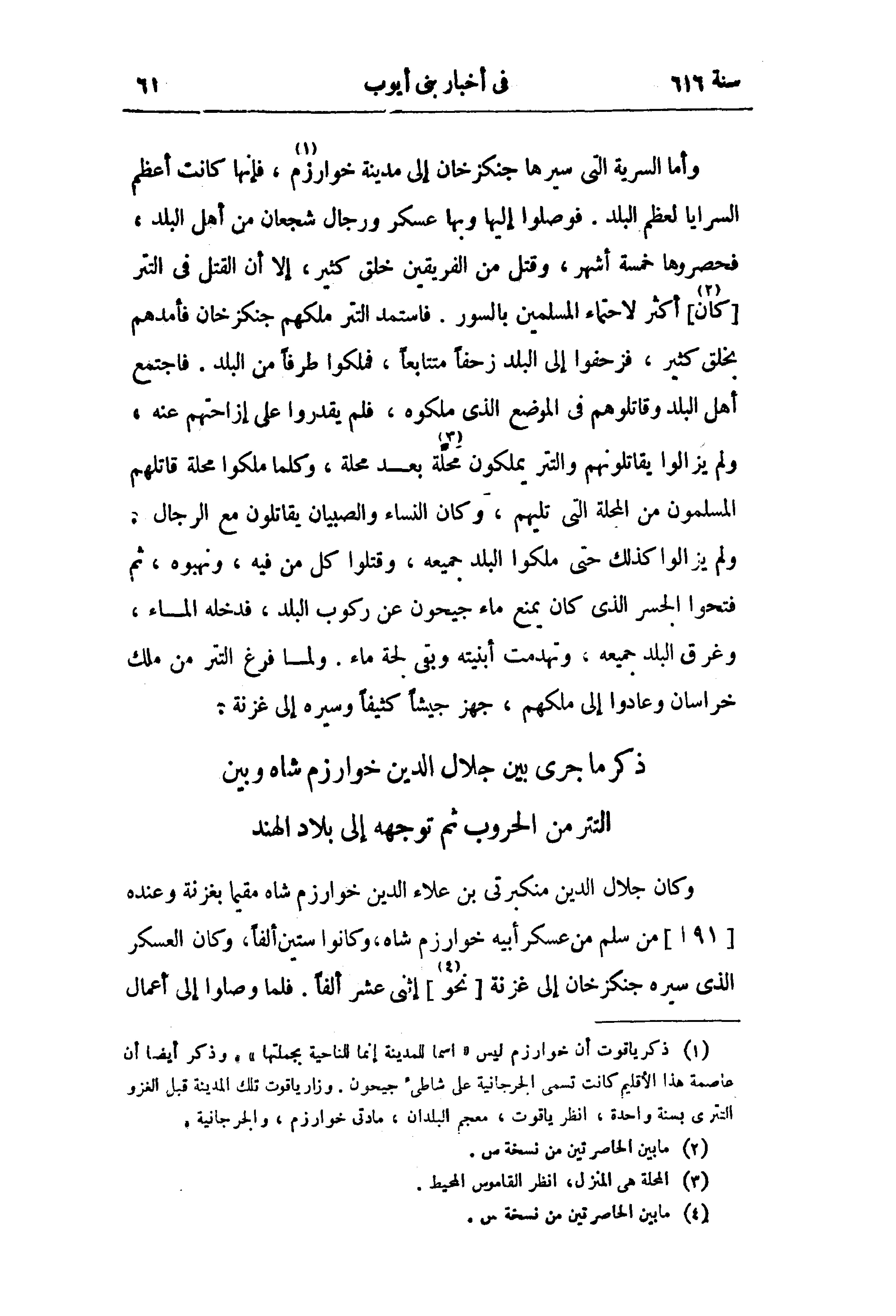 (¬1) ذكر ياقوت أن خوارزم ليس «اسما للمدينة إنما للناحية بجملتها». وذكر أيضا أن عاصمة هذا الأقليم كانت تسمى الجرجانية على شاطئ جيحون. وزار ياقوت تلك المدينة قبل الغزو التترى بسنة واحدة، انظر ياقوت، معجم البلدان، مادتى خوارزم، والجرجانية.