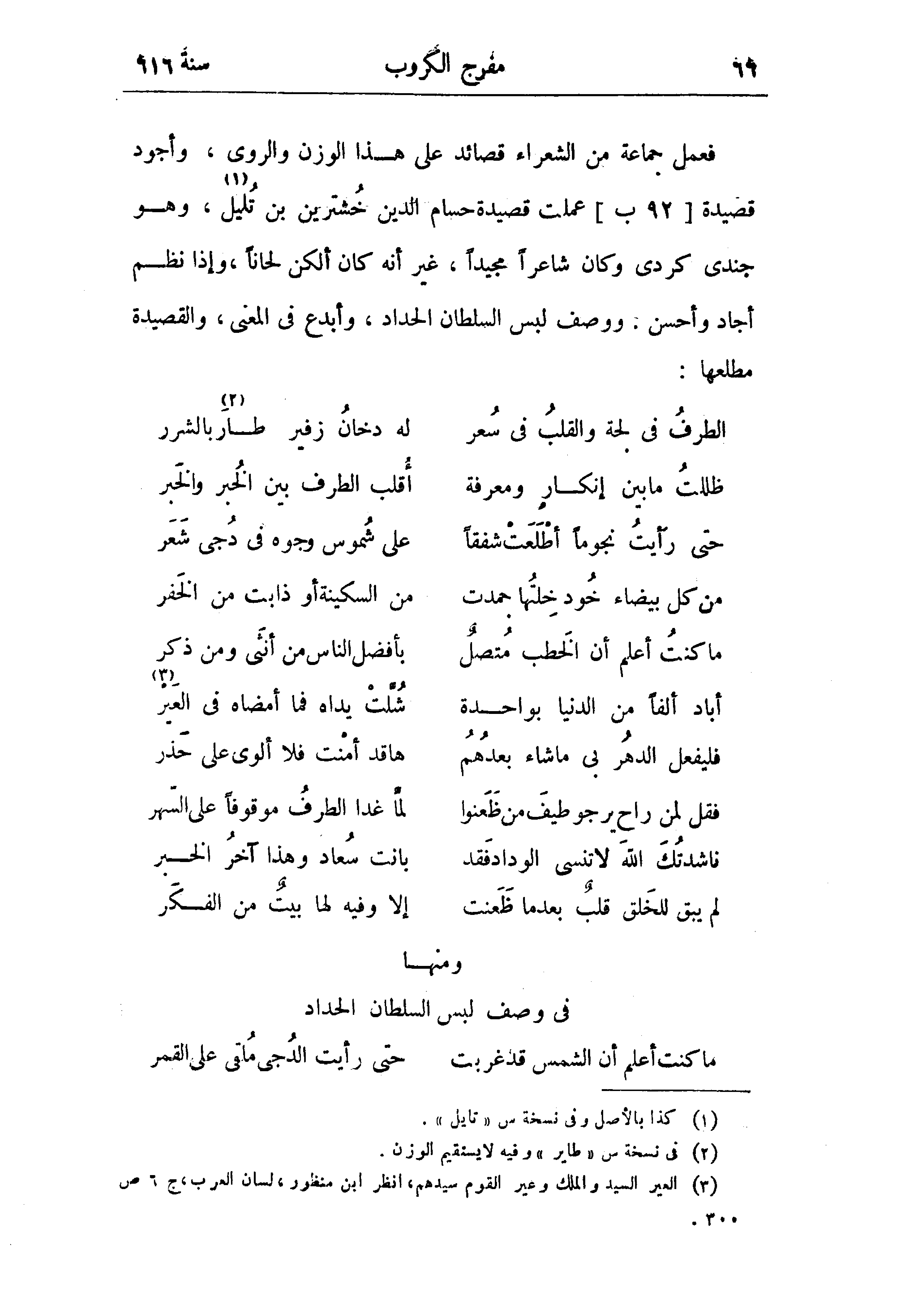 فعمل جماعة من الشعراء قصائد على هذا الوزن والروى، وأجود قصيدة [92 ب] عملت قصيدة حسام الدين خشترين بن تليل (¬1)، وهو جندى كردى وكان شاعرا مجيدا، غير أنه كان ألكن لحانا، وإذا نظم أجاد وأحسن. ووصف لبس السلطان الحداد، وأبدع في المعنى، والقصيدة مطلعها: