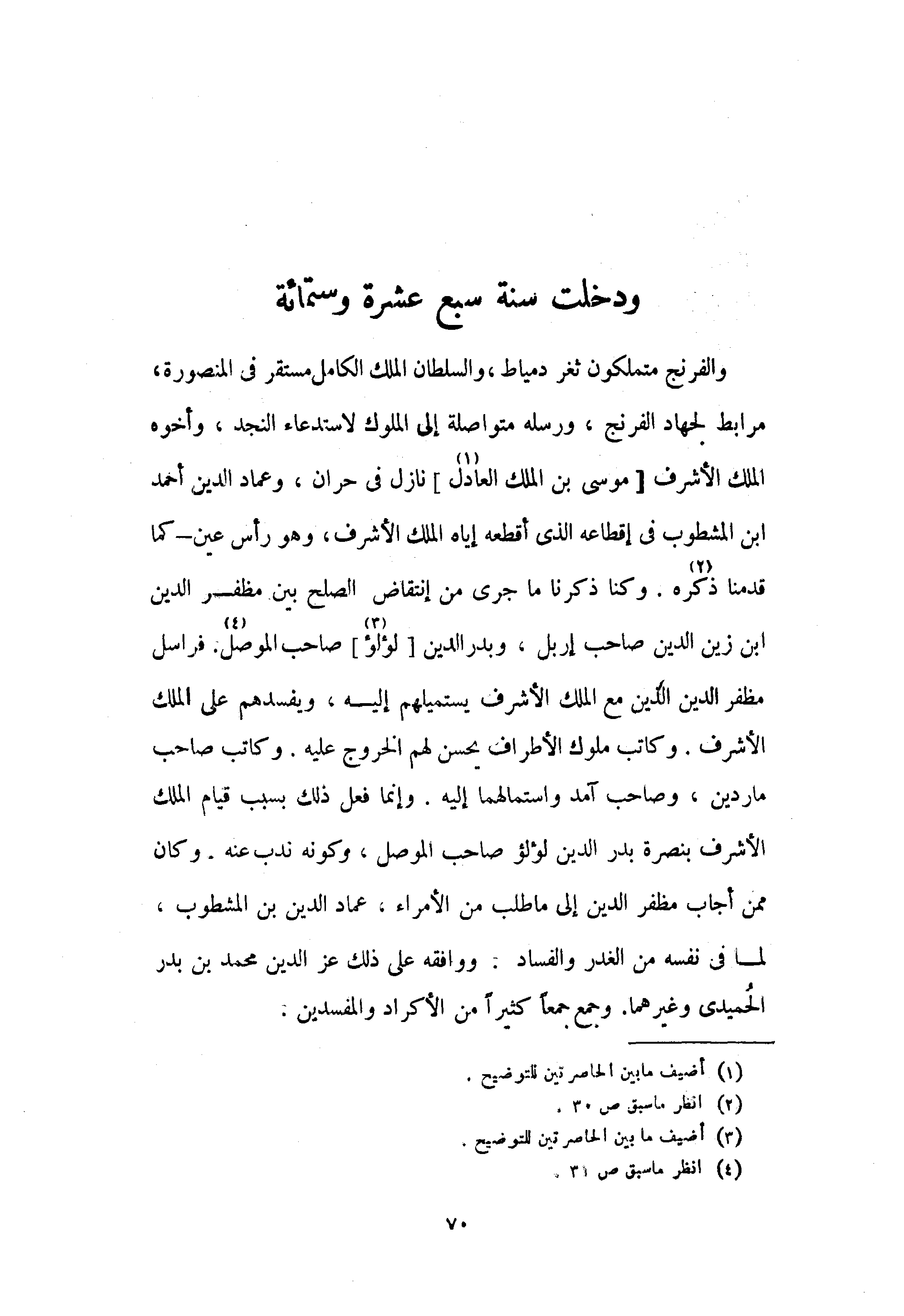 والفرنج متملكون ثغر دمياط، والسلطان الملك الكامل مستقر في المنصورة، مرابط لجهاد الفرنج، ورسله متواصلة إلى الملوك لاستدعاء النجد، وأخوه الملك الأشرف [موسى بن الملك العادل (¬1)] نازل في حران، وعماد الدين أحمد ابن المشطوب في إقطاعه الذى أقطعه إياه الملك الأشرف، وهو رأس عين - كما قدمنا ذكره (¬2). وكنا ذكرنا ما جرى من إنتقاض الصلح بين مظفر الدين ابن زين الدين صاحب إربل، وبدر الدين [لؤلؤ (¬3)] صاحب الموصل (¬4). فراسل مظفر الدين الذين مع الملك الأشرف يستميلهم إليه، ويفسدهم على الملك الأشرف. وكاتب ملوك الأطراف يحسن لهم الخروج عليه. وكاتب صاحب ماردين، وصاحب آمد واستمالهما إليه. وإنما فعل ذلك بسبب قيام الملك الأشرف بنصرة بدر الدين لؤلؤ صاحب الموصل، وكونه ندب عنه. وكان ممن أجاب مظفر الدين إلى ما طلب من الأمراء، عماد الدين بن المشطوب، لما في نفسه من الغدر والفساد. ووافقه على ذلك عز الدين محمد بن بدر الحميدى وغيرهما. وجمع جمعا كثيرا من الأكراد والمفسدين.