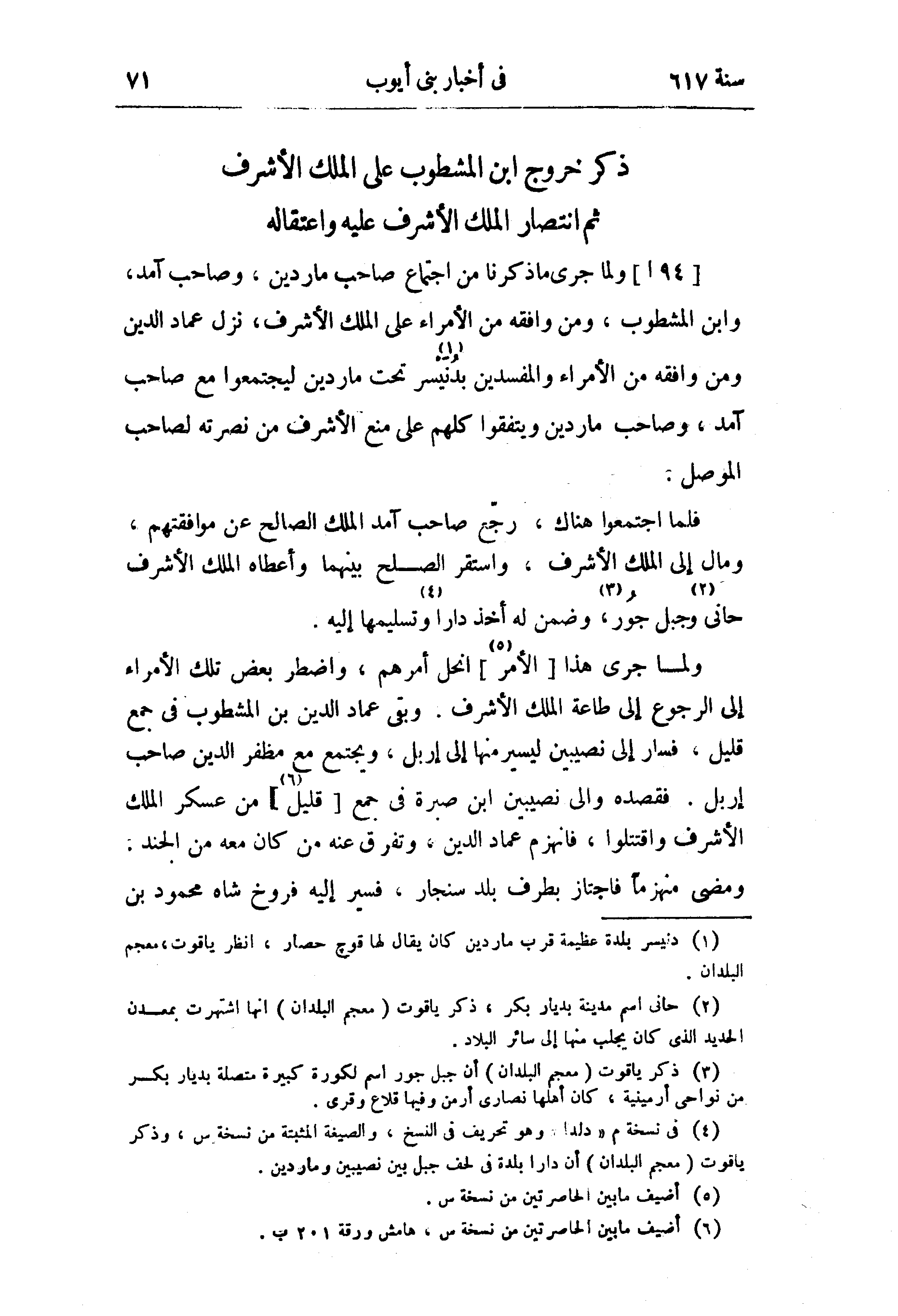 ولما جرى هذا [الأمر (¬5)] انحل أمرهم، واضطر بعض تلك الأمراء إلى الرجوع إلى طاعة الملك الأشرف. وبقى عماد الدين بن المشطوب في جمع قليل، فسار إلى نصيبين ليسير منها إلى إربل، ويجتمع مع مظفر الدين صاحب إربل. فقصده والى نصيبين ابن صبرة في جمع [قليل (¬6)] من عسكر الملك الأشرف واقتتلوا، فانهزم عماد الدين، وتفرق عنه من كان معه من الجند.