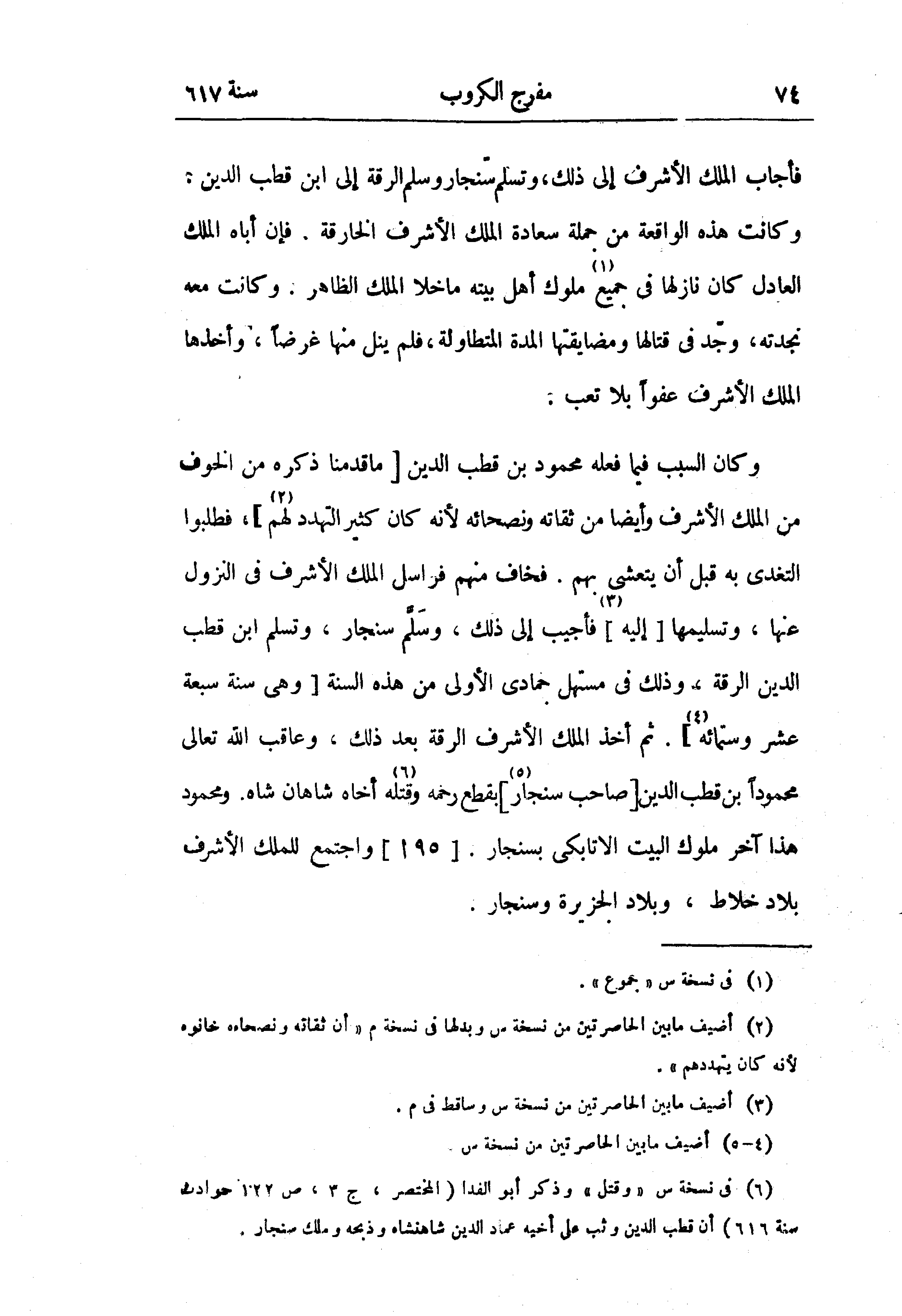 وكان السبب فيما فعله محمود بن قطب الدين [ما قدمنا ذكره من الخوف من الملك الأشرف وأيضا من ثقاته ونصحائه لأنه كان كثير التهدد لهم (¬2)]، فطلبوا التغدى به قبل أن يتعشى بهم. فخاف منهم فراسل الملك الأشرف في النزول عنها، وتسليمها [إليه (¬3)] فأجيب إلى ذلك، وسلّم سنجار، وتسلم ابن قطب الدين الرقة، وذلك في مستهل جمادى الأولى من هذه السنة [وهى سنة سبعة عشر وستمائه (¬4)]. ثم أخذ الملك الأشرف الرقة بعد ذلك، وعاقب الله تعالى محمودا بن قطب الدين [صاحب سنجار (¬5)] بقطع رحمه وقتله (¬6) أخاه شاهان شاه. ومحمود هذا آخر ملوك البيت الاتابكى بسنجار. [95 ا] واجتمع للملك الأشرف بلاد خلاط، وبلاد الجزيرة وسنجار.