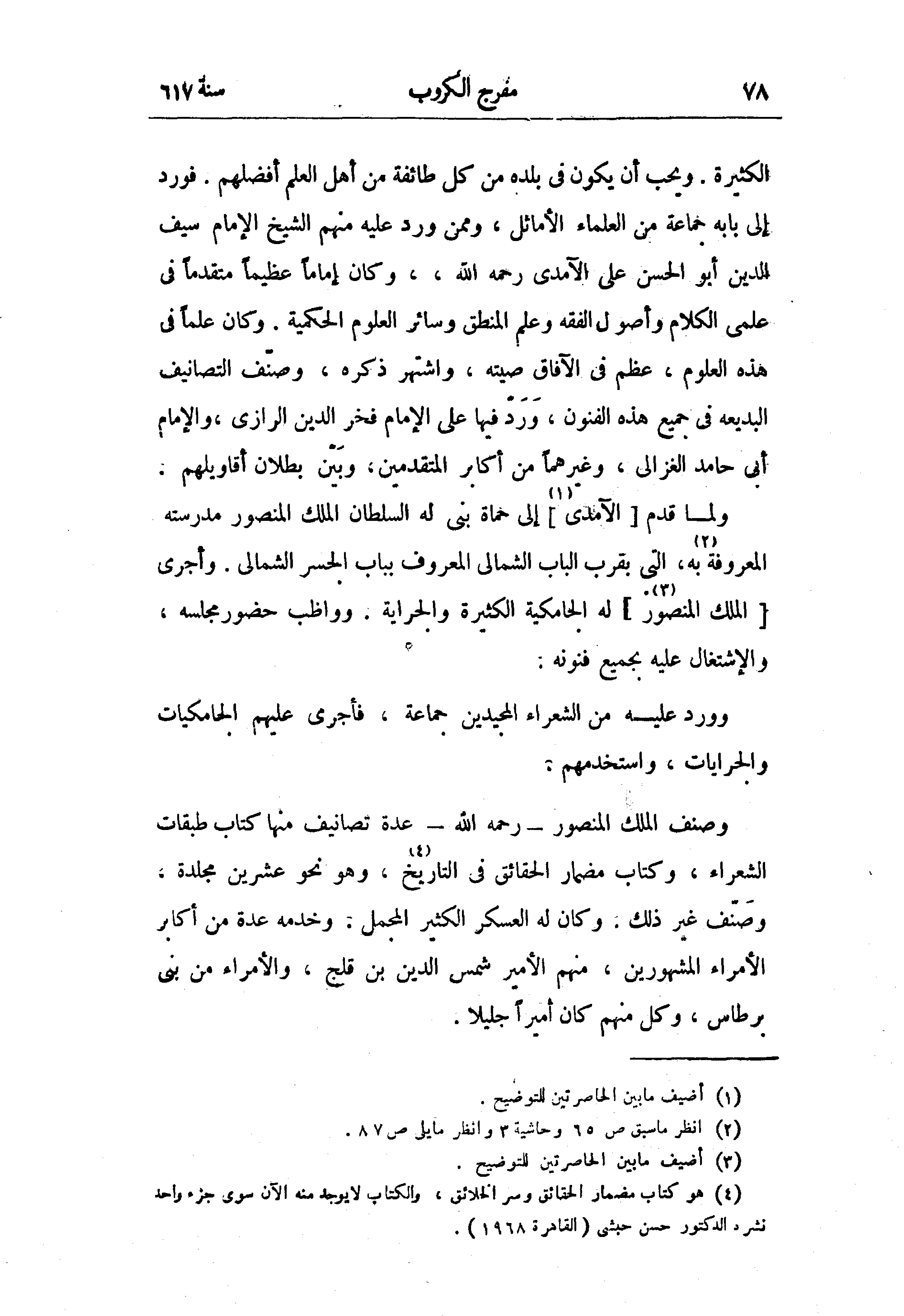 الكثيرة. ويحب أن يكون في بلده من كل طائفة من أهل العلم أفضلهم. فورد إلى بابه جماعة من العلماء الأماثل، وممن ورد عليه منهم الشيخ الإمام سيف الدين أبو الحسن على الآمدى رحمه الله، وكان إماما عظيما متقدما في علمى الكلام وأصول الفقه وعلم المنطق وسائر العلوم الحكمية. وكان علما في هذه العلوم، عظم في الآفاق صيته، واشتهر ذكره، وصنّف التصانيف البديعه في جميع هذه الفنون، وردّ فيها على الإمام فخر الدين الرازى، والإمام أبى حامد الغزالى، وغيرهما من أكابر المتقدمين، وبيّن بطلان أقاويلهم.