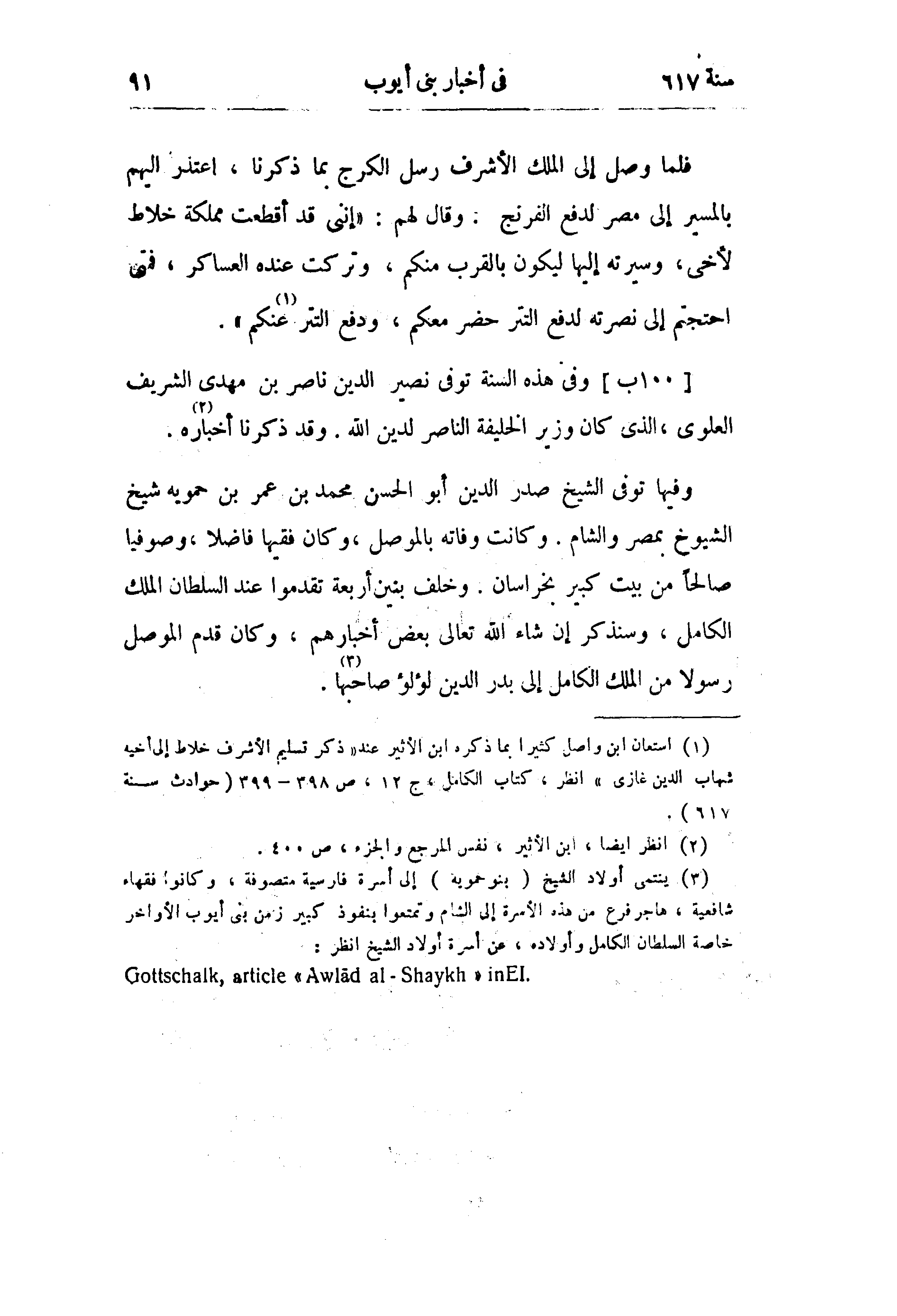 (¬3) ينتمى أولاد الشيخ (بنو حمويه) إلى أسرة فارسية متصوفة، وكانوا فقهاء شافعية، هاجر فرع من هذه الأسرة إلى الشام وتمتعوا بنفوذ كبير زمن بنى أيوب الأواخر خاصة السلطان الكامل وأولاده، عن أسرة أولاد الشيخ انظر: Gottschalk, article «Awld al - Shaykh» in EI.