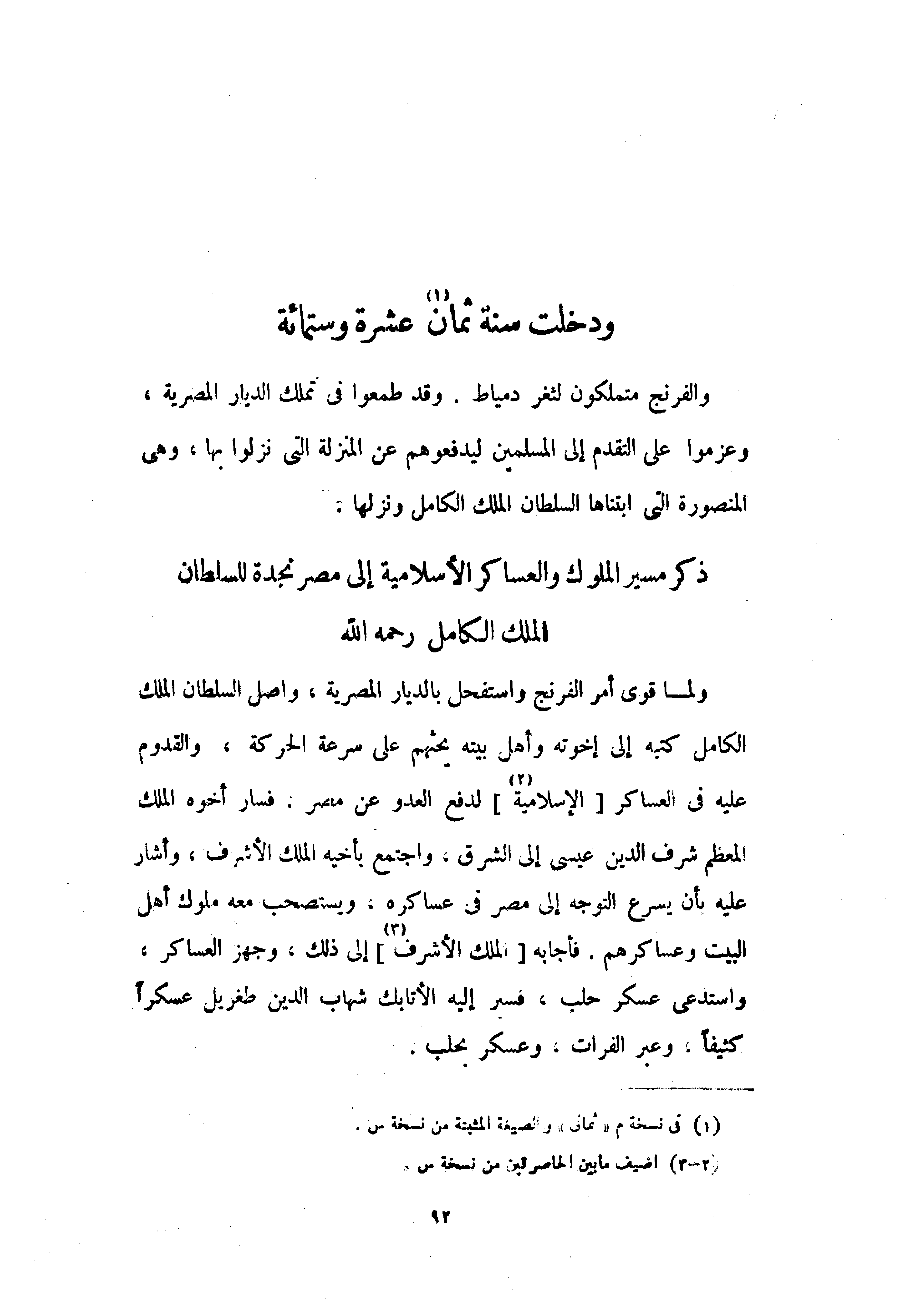 والفرنج متملكون لثغر دمياط. وقد طمعوا في تملك الديار المصرية، وعزموا على التقدم إلى المسلمين ليدفعوهم عن المنزلة التي نزلوا بها، وهى المنصورة التي ابتناها السلطان الملك الكامل ونزلها.