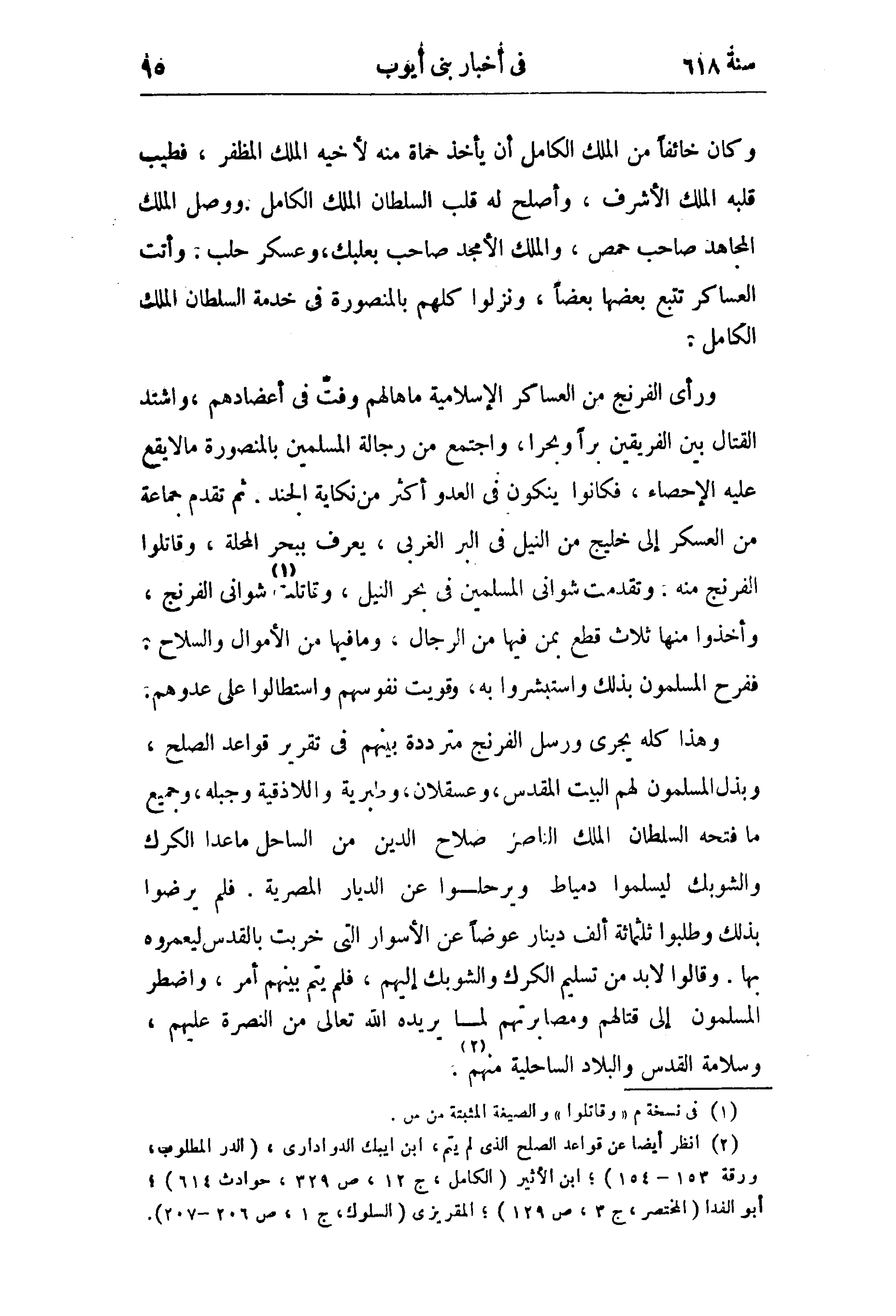 (¬2) انظر أيضا عن قواعد الصلح الذى لم يتم، ابن ايبك الدوادارى، (الدر المطلوب، ورقة 153 - 154)؛ ابن الأثير (الكامل، ج 12، ص 329، حوادث 614)؛ أبو الفدا (المختصر، ج 3، ص 129)؛ المقريزى (السلوك، ج 1، ص 206 - 207).