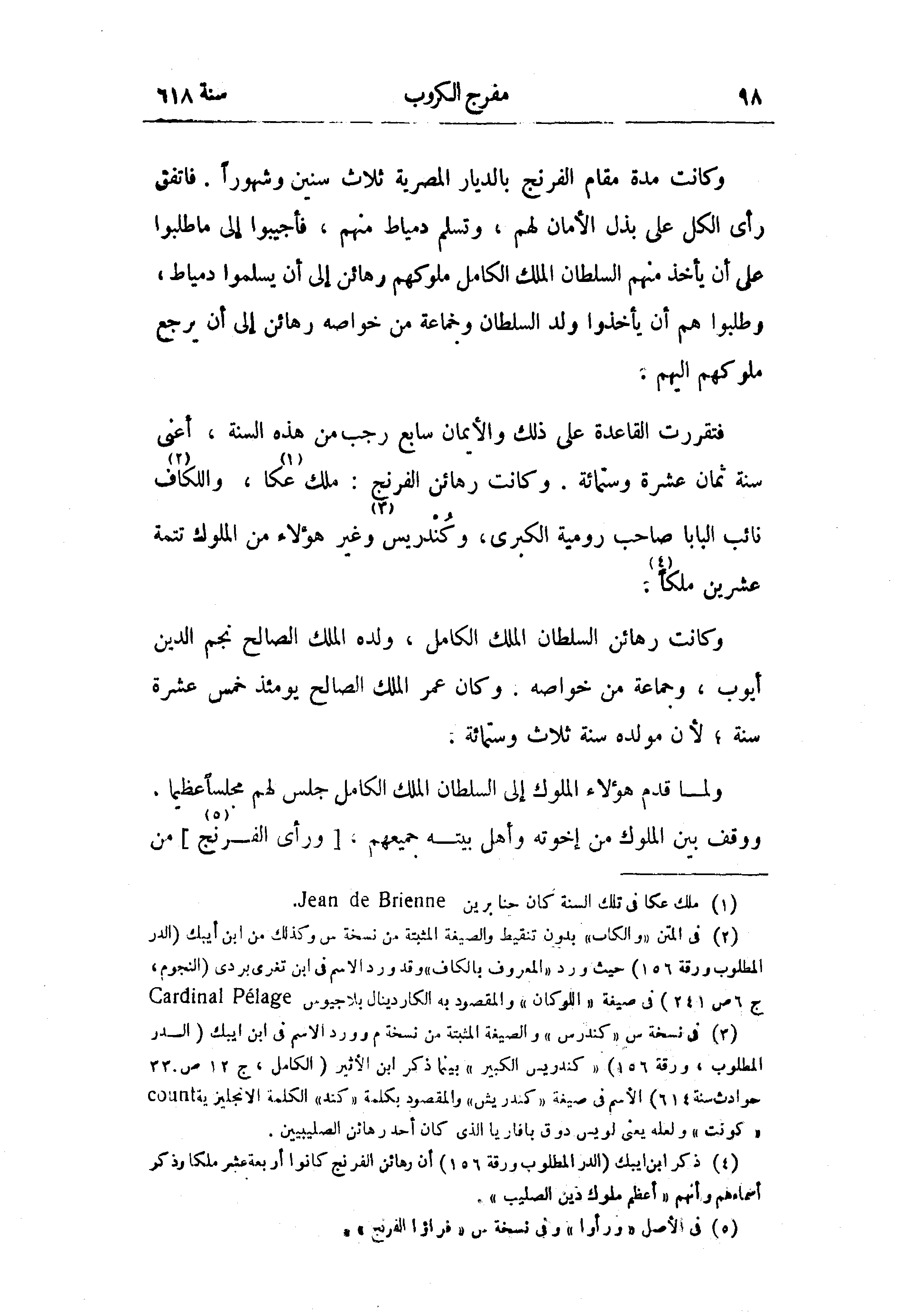 (¬3) في نسخة س «كندرس» والصيغة المثبتة من نسخة م وورد الاسم في ابن ايبك (الدر المطلوب، ورقة 156) «كندريس الكبير» بينما ذكر ابن الأثير (الكامل، ج 12 ص 330 حوادث سنة 614) الأسم في صيغة «كندريش» والمقصود بكلمة «كند» الكلمة الانجليزية Count (كونت) ولعله يعنى لويس دوق بافاريا الذى كان أحد رهائن الصليبيين.