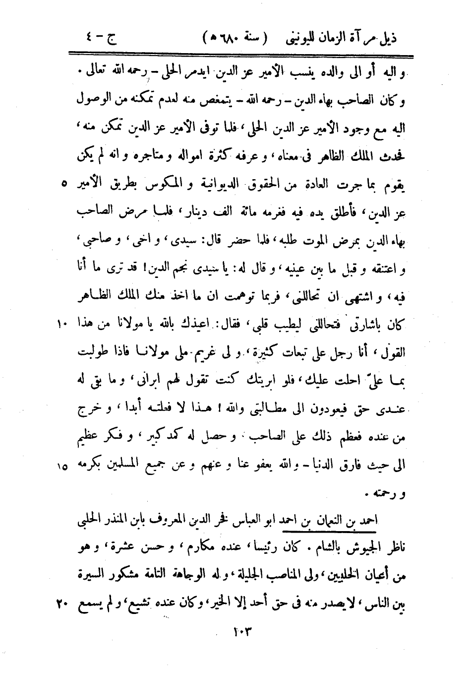 وإليه أو إلى والده ينسب الأمير عز الدين ايدمر الحلى رحمه الله تعالى. وكان الصاحب بهاء الدين رحمه الله يتمغص منه لعدم تمكنه من الوصول إليه مع وجود الأمير عز الدين الحلى، فلما توفى الأمير عز الدين تمكن منه، فحدث الملك الظاهر في معناه، وعرفه كثرة أمواله ومتاجره وأنه لم يكن يقوم بما جرت العادة من الحقوق الديوانية والمكوس بطريق الأمير عز الدين، فأطلق يده فيه فغرمه مائة ألف دينار، فلما مرض الصاحب بهاء الدين بمرض الموت طلبه، فلما حضر قال: سيدي، وأخي، وصاحبي، واعتنقه وقبل ما بين عينيه، وقال له: يا سيدي نجم الدين، قد ترى ما أنا فيه، واشتهى أن تحاللني، فربما توهمت أن ما أخذ منك الملك الظاهر كان بإشارتي فتحاللني لطيب قلبي، فقال: أعيذك بالله يا مولانا من هذا القول، أنا رجل على تبعات كثيرة، ولي غريم ملى مولانا فإذا طولبت بما علي أحلت عليك، فلو أبريتك كنت تقول لهم أبراني، وما بقي له عندي حق فيعودون إلى مطالبتي والله! هذا لا فعلته أبداً، وخرج من عنده فعظم ذلك على الصاحب. وحصل له كمد كبير، وفكر عظيم إلى حيث فارق الدنيا والله يعفو عنا وعنهم وعن جميع المسلمين بكرمه ورحمته.