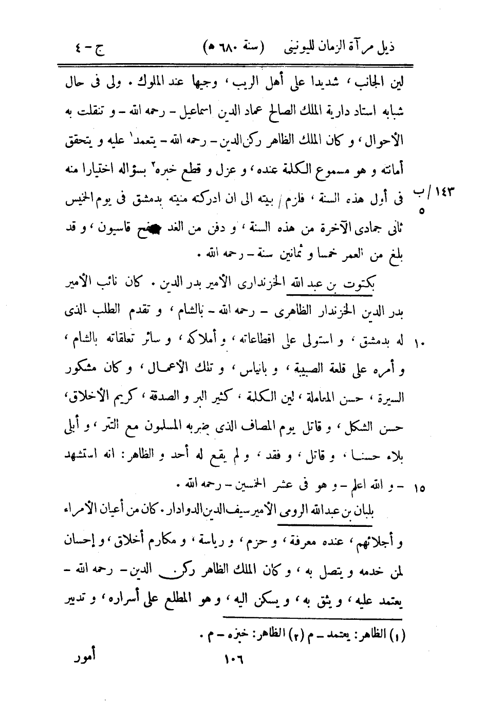 لين الجانب، شديداً على أهل الريب، وجيهاً عند الملوك. ولى في حال شبابه استاد دارية الملك الصالح عماد الدين اسماعيل رحمه الله وتنقلت به الأحوال، وكان الملك الظاهر ركن الدين رحمه الله يتعمد عليه ويتحقق أمانته وهو مسموع الكلمة عنده، وعزل وقطع خبره بسؤاله اختياراً منه في أول هذه السنة، فلزم بيته إلى أن أدركته منيته بدمشق في يوم الخميس ثاني جمادى الآخرة من هذه السنة، ودفن من الغد بسفح قاسيون، وقد بلغ من العمر خمساً وثمانين سنة رحمه الله.