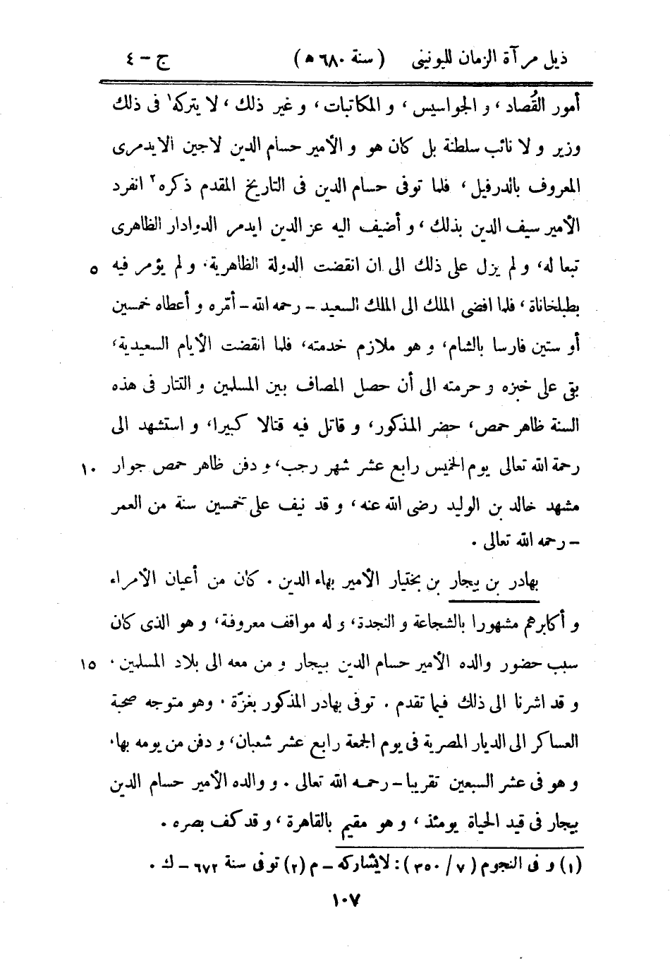 أمور القصاد، والجواسيس، والمكاتبات، وغير ذلك، لا يتركه في ذلك وزير ولا نائب سلطنة بل كان هو والأمير حسام الدين لاجين الايدمرى المعروف بالدرفيل، فلما توفى حسام الدين في التاريخ المقدم ذكره انفرد الأمير سيف الدين بذلك، وأضيف إليه عز الدين ايدمر الدوادار الظاهري تبعاً له، ولم يزل على ذلك إلى أن انقضت الدولة الظاهرية. ولم يؤمر فيه بطبلخاناة، فلما أفضى الملك إلى الملك السعيد رحمه الله أمره وأعطاه خمسين أو ستين فارساً بالشام، وهو ملازم خدمته، فلما انقضت الأيام السعيدية، بقى على خبزه وحرمته إلى أن حصل المصاف بين المسلمين والتتار في هذه السنة ظاهر حمص، حضر المذكور، وقاتل فيه قتالاً كبيراً، واستشهد إلى رحمة الله تعالى يوم الخميس رابع عشر شهر رجب، ودفن ظاهر حمص جوار مشهد خالد بن الوليد رضي الله عنه، وقد نيف على خمسين سنة من العمر رحمه الله تعالى.
