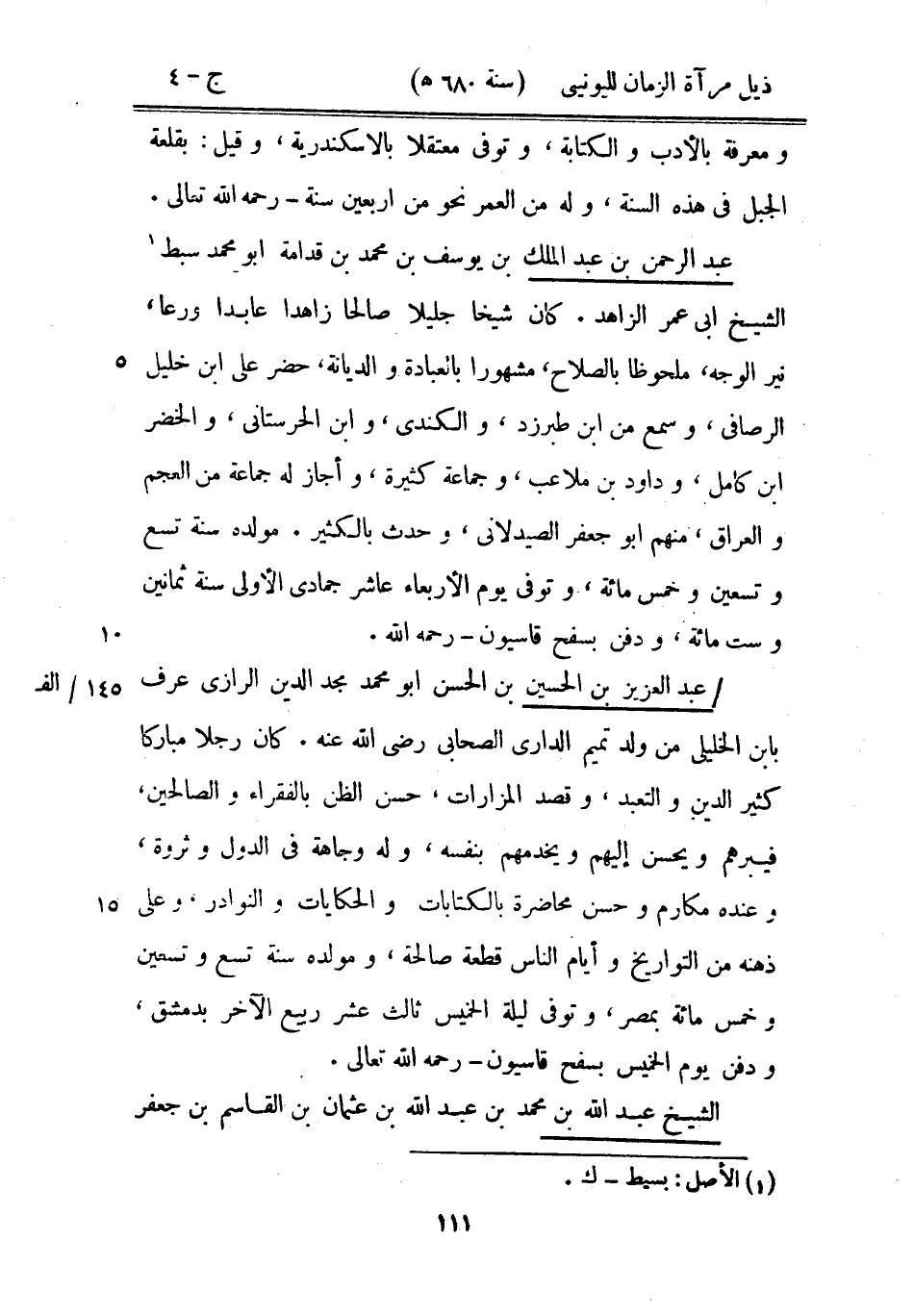 عبد الرحمن بن عبد الملك بن يوسف بن محمد بن قدامة أبو محمد سبط الشيخ أبي عمر الزاهد. كان شيخاً جليلاً صالحاً زاهداً عابداً ورعاً، نير الوجه، ملحوظاً بالصلاح، مشهوراً بالعبادة والديانة، حضر على ابن خليل الرصافي، وسمع من ابن طبرزد، والكندى، وابن الحرستاني، والخضر ابن كامل، وداود بن ملاعب، وجماعة كثيرة، وأجاز له جماعة من العجم والعراق، منهم أبو جعفر الصيدلاني، وحدث بالكثير. مولده سنة تسع وتسعين وخمس مائة، وتوفى يوم الأربعاء عاشر جمادى الأولى سنة ثمانين وست مائة، ودفن بسفح قاسيون رحمه الله.