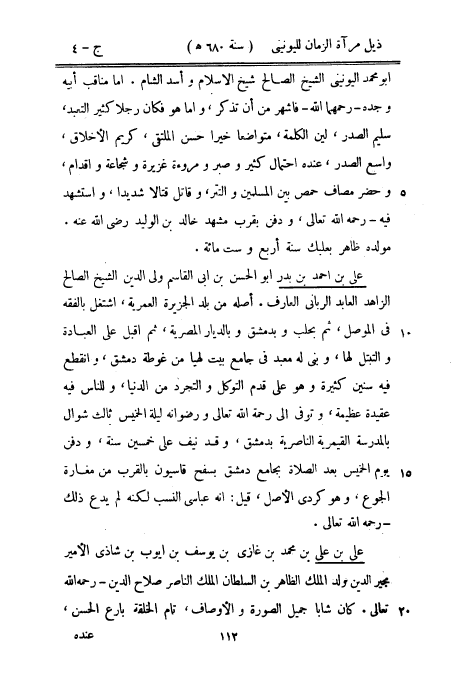 أبو محمد اليونيني السيخ الصالح شيخ الاسلام وأسد الشام. أما مناقب أبيه وجده رحمهما الله فأشهر من أن تذكر، وأما هو فكان رجلاً كثير التعبد، سليم الصدر، لين الكلمة، متواضعاً خير حسن الملتقى، كريم الأخلاق، واسع الصدر، عنده احتمال كثير وصبر ومروءة غزيرة وشجاعة وإقدام، وحضر مصاف حمص بين المسلمين والتتر، وقاتل قتالاً شديداً، واستشهد فيه رحمه الله تعالى، ودفن بقرب مشهد خالد بن الوليد رضي الله عنه. مولده ظاهر بعلبك سنة أربع وست مائة.