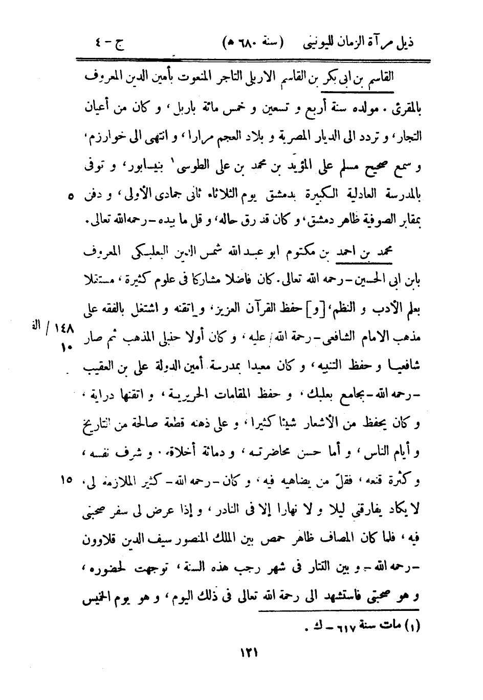 محمد بن أحمد بن مكتوم أبو عبد الله شمس الدين البعلبكي المعروف بابن أبي الحسين رحمه الله تعالى. كان فاضلاً مشاركاً في علوم كثيرة، مستقلاً بعلم الأدب والنظم، وحفظ القرآن العزيز، وأتقنه واشتغل بالفقه على مذهب الامام الشافعي رحمة الله عليه، وكان أولاً حنبلي المذهب ثم صار شافعياً وحفظ التنبيه، وكان معيداً بمدرسة أمين الدولة على بن العقيب رحمه الله بجامع بعلبك، وحفظ المقامات الحريرية، وأتقنها دراية، وكان يحفظ من الأشعار شيئاً كثيراً، وعلى ذهنه قطعة صالحة من التاريخ وأيام الناس، وأما حسن محاضرته، ودماثة أخلاقه، وشرف نفسه، وكثرة قنعه، فقل من يضاهيه فيه، وكان رحمه الله كثير الملازمة لي، لا يكاد يفارقني ليلاً ولا نهاراً إلا في النادر، وإذا عرض لي سفر صحبني فيه، فلما كان المصاف ظاهر حمص بين الملك المنصور سيف الدين قلاوون رحمه الله وبين التتار في شهر رجب هذه السنة، توجهت لحضوره، وهو صحبتي فاستشهد إلى رحمة الله تعالى في ذلك اليوم، وهو يوم الخميس