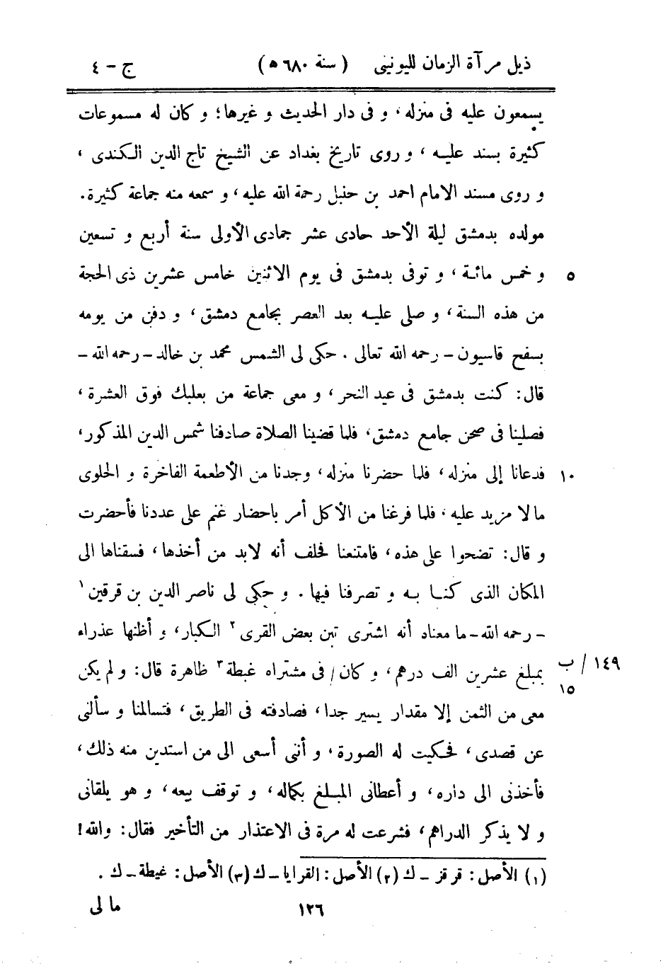 يسمعون عليه في منزله، وفي دار الحديث وغيرها؛ وكان له مسموعات كثيرة بسند عليه، وروى تاريخ بغداد عن الشيخ تاج الدين الكندي، وروى مسند الامام أحمد بن حنبل رحمة الله عليه، وسمعه منه جماعة كثيرة. مولده بدمشق ليلة الأحد حادي عشر جمادى الأولى سنة أربع وتسعين وخمس مائة، وتوفى بدمشق في يوم الاثنين خامس عشرين ذى الحجة من هذه السنة، وصلى عليه بعد العصر بجامع دمشق، ودفن من يومه بسفح قاسيون رحمه الله تعالى. حكى لي الشمس محمد بن خالد رحمه الله قال: كنت بدمشق في عيد النحر، ومعي جماعة من بعلبك فوق العشرة، فصلينا في صحن جامع دمشق، فلما قضينا الصلاة صادفنا شمس الدين المذكور، فدعانا إلى منزله، فلما حضرنا منزله، وجدنا من الأطعمة الفاخرة والحلوى ما لا مزيد عليه، فلما فرغنا من الأكل أمر بإحضار غنم على عددنا فأحضرت وقال: تضحوا على هذه، فامتنعنا فحلف أنه لابد من أخذها، فسقناها إلى المكان الذي كنا به وتصرفنا فيها. وحكى لي ناصر الدين بن قرقين رحمه الله ما معناه أنه اشترى تبن بعض القرى الكبار، وأظنها عذراء بمبلغ عشرين ألف درهم، وكان في مشتراه غبطة ظاهرة قال: ولم يكن معي من الثمن إلا مقدار يسير جداً، فصادفته في الطريق، فتسالمنا وسألني عن قصدي، فحكيت له الصورة، وأنني أسعى إلى من أستدين منه ذلك، فأخذني إلى داره، وأعطاني المبلغ بكماله، وتوقف بيعه، وهو يلقاني ولا يذكر الدراهم، فشرعت له مرة في الاعتذار من التأخير فقال: والله!