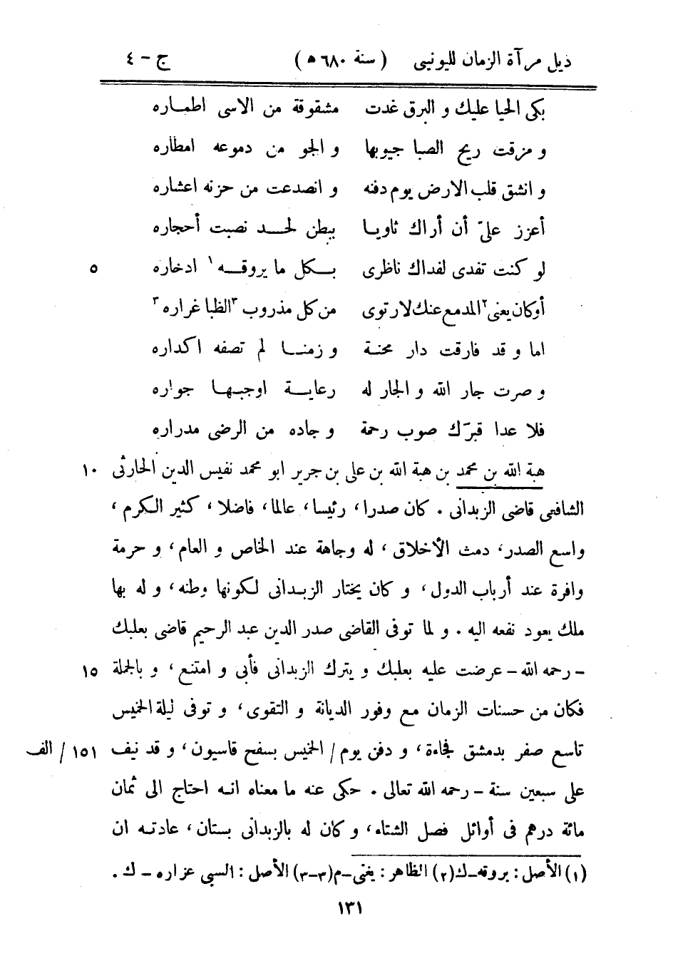 هبة الله بن محمد بن هبة الله بن علي بن جرير لأيو محمد نفيس الدين الحارثي الشافعي قاضي الزبداني. كان صدراً، رئيساً، عالماً، فاضلاً، كثير الكرم، واسع الصدر، دمث الأخلاق، له وجاهة عند الخاص والعام، وحرمة وافرة عند أرباب الدول، وكان يختار الزبداني لكونها وطنه، وله بها ملك يعود نفعه إليه. ولما توفى القاضي صدر الدين عبد الرحيم قاضي بعلبك رحمه الله عرضت عليه بعلبك ويترك الزبداني فأبى وامتنع، وبالجملة فكان من حسنات الزمان مع وفور الديانة والتقوى، وتوفى ليلة الخميس تاسع صفر بدمشق فجاءة، ودفن يوم الخميس بسفح قاسيون، وقد نيف على سبعين سنة رحمه الله تعالى. حكى عنه ما معناه أنه احتاج إلى ثمان مائة درهم في أوائل فصل الشتاء، وكان له بالزبداني بستان، عادته أن