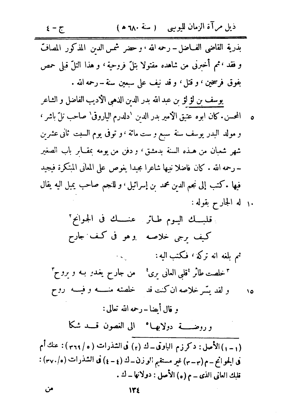يوسف بن لؤلؤ بن عبد الله بدر الدين الذهبي الأديب الفاضل والشاعر المحسن. كان أبوه عتيق الأمير بدر الدين دلدرم الياروقي صاحب تل باشر، ومولد البدر يوسف سنة سبع وست مائة، وتوفى يوم السبت ثاني عشرين شهر شعبان من هذه السنة بدمشق، ودفن يوم السبت ثاني عشرين شهر شعبان من هذه السنة بدمشق، ودفن من يومه بمقابر باب الصغير رحمه الله. كان فاضلاً نبيهاً شاعراً مجيداً يغوص على المعاني المبتكرة فيجيد فيها. كتب إلى نجم الدين محمد بن إسرائيل، وللنجم صاحب يميل إليه يقال له الجارح بقوله:
