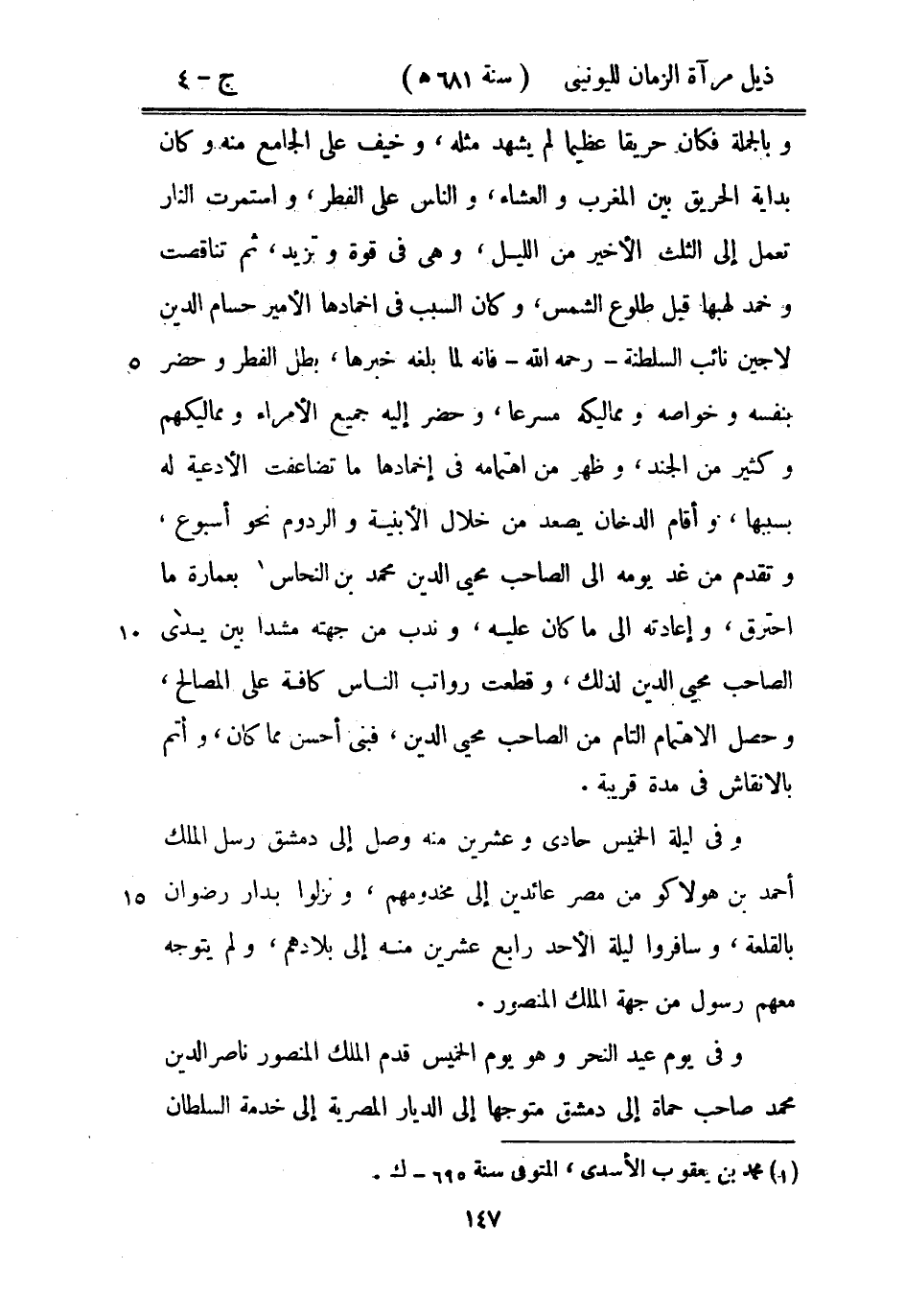 وفي ليلة الخميس حادي وعشرين منه وصل إلى دمشق رسل الملك أحمد بن هولاكو من مصر عائدين إلى مخدومهم، ونزلوا بدار رضوان بالقلعة، وسافروا ليلة الأحد رابع عشرين منه إلى بلادهم، ولم يتوجه معهم رسول من جهة الملك المنصور.