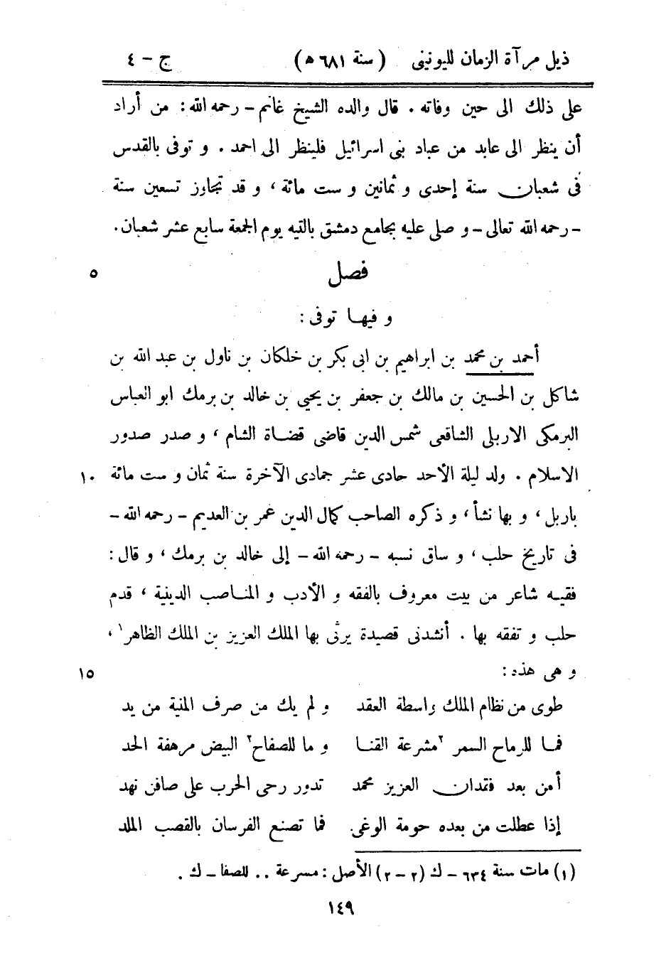 وفيها توفى: أحمد بن محمد بن إبراهيم بن أبي بكر بن خلكان بن ناول بن عبد الله بن شاكل بن الحسين بن مالك بن جعفر بن يحيى بن خالد بن برمك أبو العباس البرمكي الاربلي الشافعي شمس الدين قاضي قضاة الشام، وصدر صدور الاسلام. وله ليلة الأحد حادي عشر جمادى الآخرة سنة ثمان وست مائة باربل، وبها نشأ، وذكره الصاحب كمال الدين عمر بن العديم رحمه الله في تاريخ حلب، وساق نسبه رحمه الله إلى خالد بن برمك، وقال: فقيه شاعر من بيت معروف بالفقه والأدب والمناصب الدينية، قدم حلب وتفقه بها. أنشدني قصيدة يرثي بها الملك العزيز بن الملك الظاهر، وهي هذه: