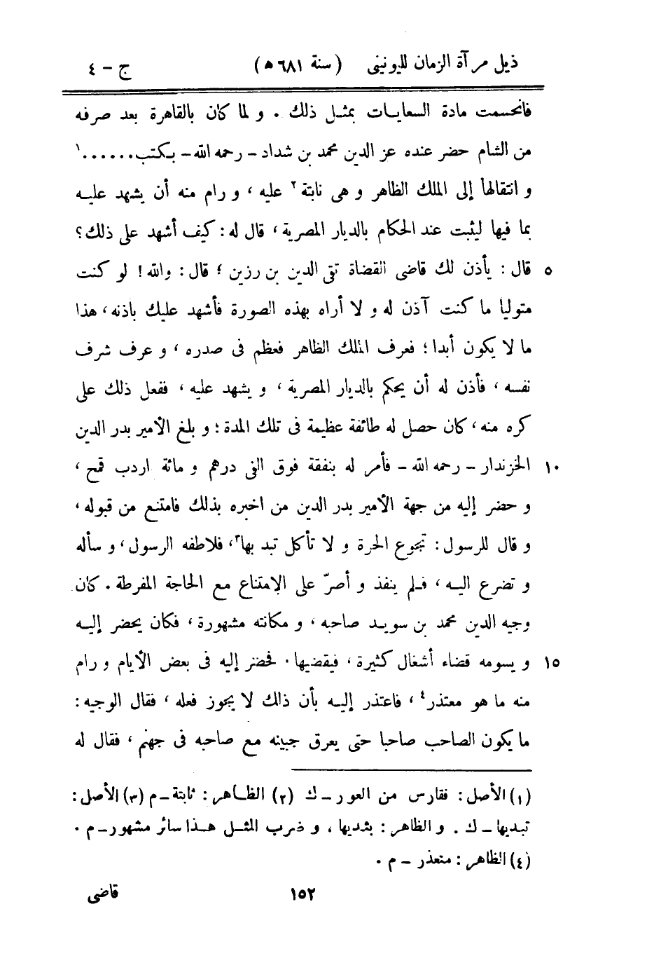 فانحسمت مادة السعايات بمثل ذلك. ولما كان بالقاهرة بعد صرفه من الشام حضر عنده عز الدين محمد بن شداد رحمه الله بكتب..... وانتقالها إلى الملك الظاهر وهي نابتة عليه، ورام منه أن يشهد عليه بما فيها ليثبت عند الحكام بالديار المصرية، قال له: كيف أشهد على ذلك؟ قال: يأذن لك قاضي القضاة تقي الدين بن رزين، قال: والله! لو كنت متولياً ما كنت آذن له ولا أراه بهذه الصورة فأشهد عليك بإذنه، هذا ما لا يكون أبداً؛ فعرف الملك الظاهر فعظم في صدره، وعرف شرف نفسه، فأذن له أن يحكم بالديار المصرية، ويشهد عليه، ففعل ذلك على كره منه، كان حصل له طائفة عظيمة في تلك المدة؛ وبلغ الأمير بدر الدين الخزندار رحمه الله فأمر له بنفقة فوق ألفي درهم ومائة أردب قمح، وحضر إليه من جهة الأمير بدر الدين من أخبره بذلك فامتنع من قبوله، وقال للرسول: تجوع الحرة ولا تأكل تبد بها فلاطفه الرسول، وسأله وتضرع إليه، فلم ينفذ وأصر على الامتناع مع الحاجة المفرطة. كان وجيه الدين محمد بن سويد صاحبه، ومكانته مشهورة، فكان يحضر إليه ويسومه قضاء أشغال كثيرة، فيقضيها، فحضر إليه في بعض الأيام ورام منه ما هو معتذر، فاعتذر إليه بأن ذلك لا يجوز فعله، فقال الوجيه: ما يكون الصاحب صاحباً حتى يعرق جبينه مع صاحبه في جهنم، فقال له
