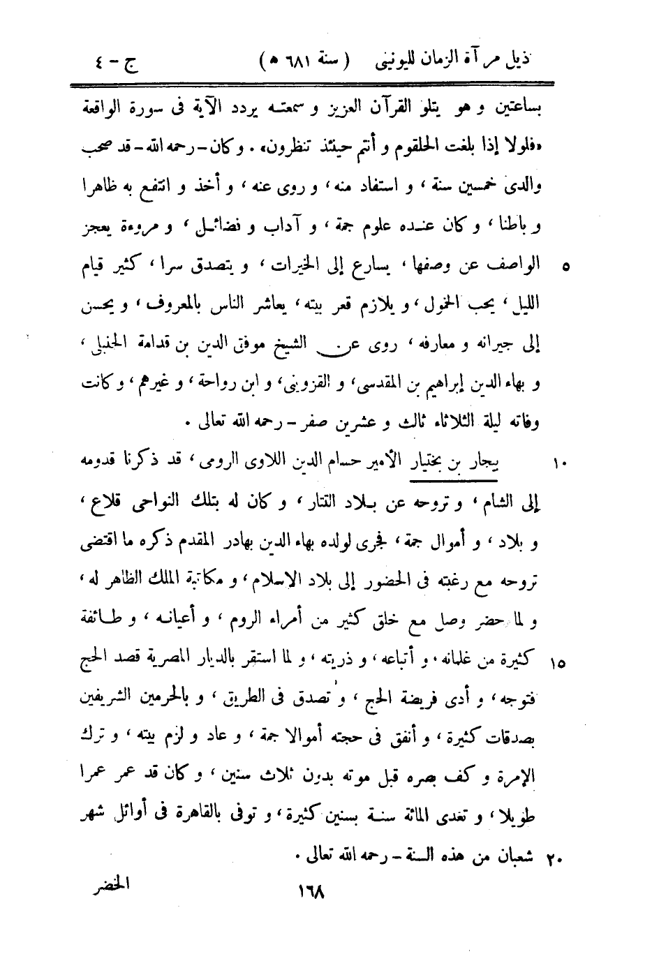 بساعتين وهو يتلو القرآن العزيز وسمعته يردد الآية في سورة الواقعة " فلولا إذا بلغت الحلقوم وأنتم حينئذ تنظرون ". وكان رحمه الله قد صحب والدي خمسين سنة، واستفاد منه، وروى عنه، وأخذ وانتفع به ظاهراً وباطناً، وكان عنده علوم جمة، وآداب وفضائل، ومروءة يعجز الواصف عن وصفها، يسارع إلى الخيرات، ويتصدق سراً، كثير قيام الليل، يحب الخمول، ويلازم قعر بيته، يعاشر الناس بالمعروف، ويحسن إلى جيرانه ومعارفه، روى عن الشيخ موفق الدين بن قدامة الحنبلي، وبهاء الدين إبراهيم بن المقدسي، والقزويني، وابن رواحة، وغيرهم، وكانت وفاته ليلة الثلاثاء ثالث وعشرين صفر رحمه الله تعالى.