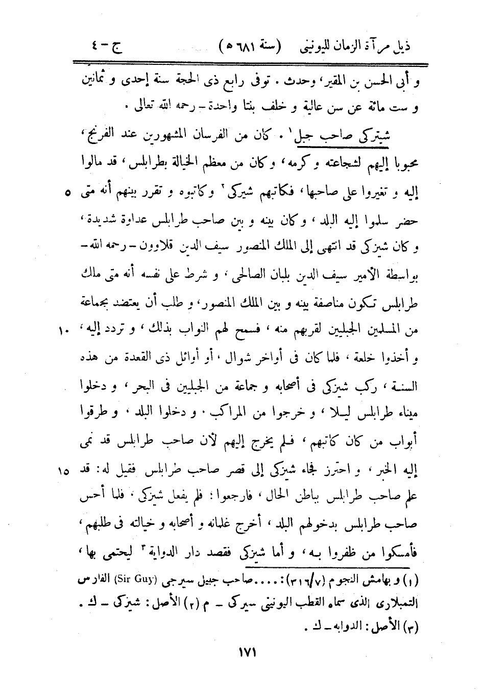شيتركى صاحب جبل. كان من الفرسان المشهورين عند الفرنج، محبوباً إليهم لشجاعته وكرمه، وكان من معظم الخيالة بطرابلس، وقد مالوا إليه وتغيروا على صاحبها، فكاتبهم شيركى وكاتبوه وتقرر بينهم أنه متى حضر سلموا إليه البلد، وكان بينه وبين صاحب طرابلس عداوة شديدة، وكان شيركى قد انتهى إلى الملك المنصور سيف الدين قلاوون رحمه الله بواسطة الأمير سيف الدين بلبان الصالحي، وشرط على نفسه أنه متى ملك طرابلس تكون مناصفة بينه وبين الملك المنصور، وطلب أن يتعضد بجماعة من المسلمين الجبليين لقربهم منه، فسمح لهم النواب بذلك، وتردد إليه، وأخذوا خلعه، فلما كان في أواخر شوال، أو أوائل ذى القعدة من هذه السنة، ركب شيزكى في أصحابه وجماعة من الجبليين في البحر، ودخلوا ميناء طرابلس ليلاً، وخرجوا من المراكب. ودخلوا البلد، وطرقوا أبواب من كان كاتبهم، فلم يخرج إليهم لأن صاحب طرابلس قد نمى إليه الخبر، واحترز فجاء شيزكى إلى قصر صاحب طرابلس فقيل له: قد علم صاحب طرابلس علم صاحب طرابلس بباطن الحال فارجعوا فلم يفعل شيزكى: فلم احس صاحب طرابلس بدخولهم البلد، أخرج غلمانه وأصحابه وخيالته في طلبهم، فأمسكوا من ظفروا به، وأما شيزكى فقصد دار الدواية ليحتمي بها،