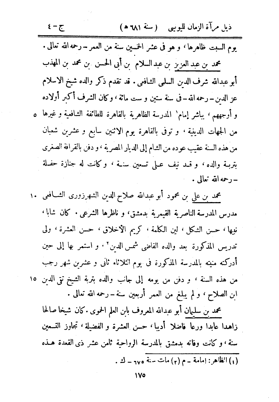 محمد بن سليمان أبو عبد الله المعروف بابن العلم الحموي. كان شيخاً صالحاً زاهداً عابداً ورعاً فاضلاً أديباً، حسن العشرة والفضيلة، تجاوز التسعين سنة، وكانت وفاته بدمشق بالمدرسة الرواحية ثامن عشر ذى القعدة هذه