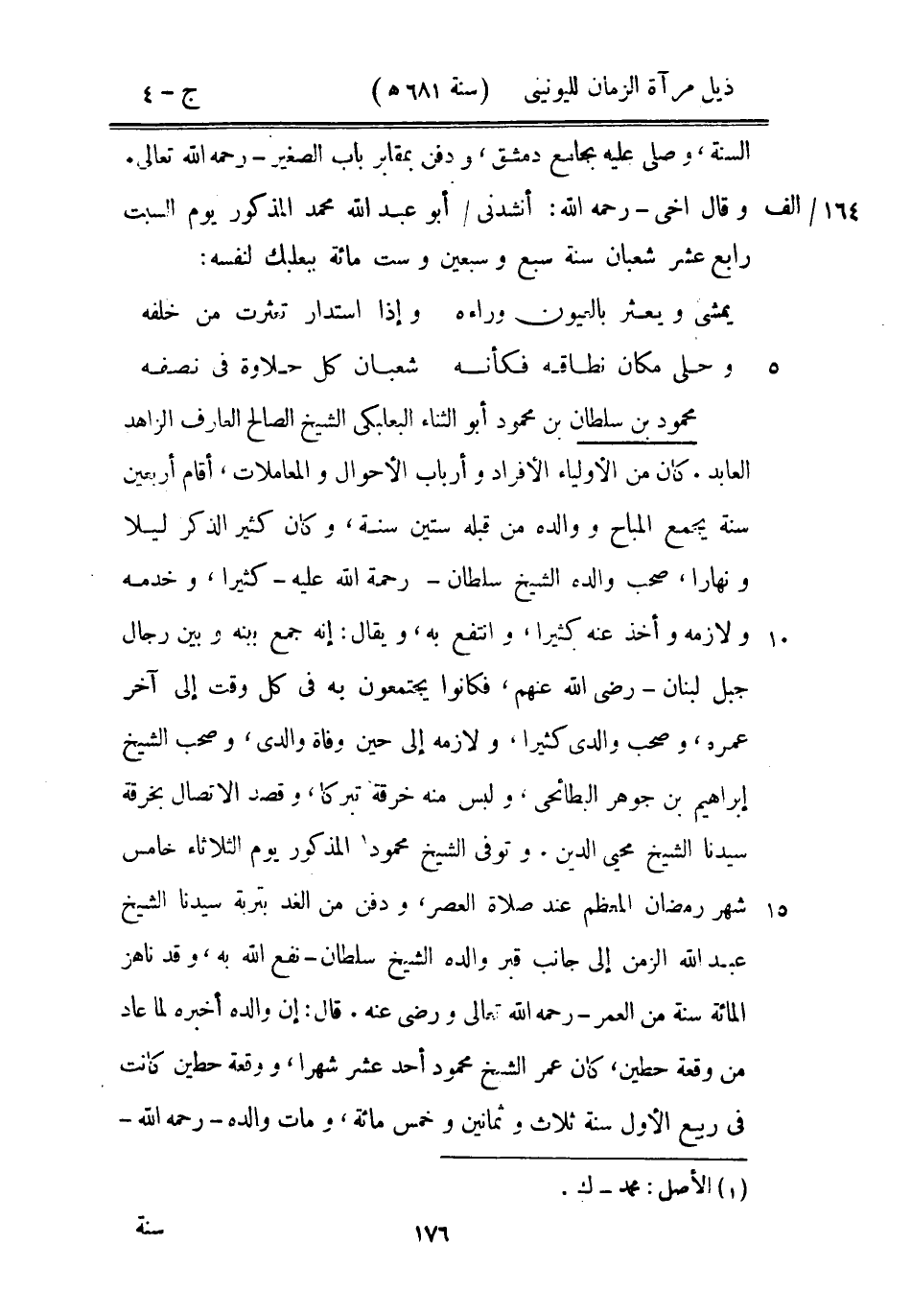 محمود بن سلطان بن محمود أبو الثناء البعلبكي الشيخ الصالح العارف الزاهد العابد. كان من الأولياء الأفراد وأرباب الأحوال والمعاملات، أقم أربعين سنة يجمع المباح ووالده من قبله ستين سنة، وكان كثير الذكر ليلاً ونهاراً، صحب والده الشيخ سلطان رحمة الله عليه كثيراً، وخدمه ولازمه وأخذ عنه كثيراً، وانتفع به، ويقال: إنه جمع بينه وبين رجال جبل لبنان رضي الله عنهم، فكانوا يجتمعون به في كل وقت إلى آخر عمره، وصحب والدي كثيراً، ولازمه إلى حين وفاة والدي، وصحب الشيخ إبراهيم بن جوهر البطائحي، ولبس منه خرقة تبركاً، وقصد الاتصال بخرقة سيدنا الشيخ محي الدين. وتوفى الشيخ محمود المذكور يوم الثلاثاء خامس شهر رمضان المعظم عند صلاة العصر، ودفن من الغد بتربة سيدنا الشيخ عبد الله الزمن إلى جانب قبر والده الشيخ سلطان نفع الله به، وقد ناهز المائة سنة من العمر رحمه الله تعالى ورضي عنه. قال: إن والده أخبره لما عاد من وقعة حطين، كان عمر الشيخ محمود أحد عشر شهراً، ووقعة حطين كانت في ربيع الأول سنة ثلاث وثمانين وخمس مائة، ومات والده رحمه الله