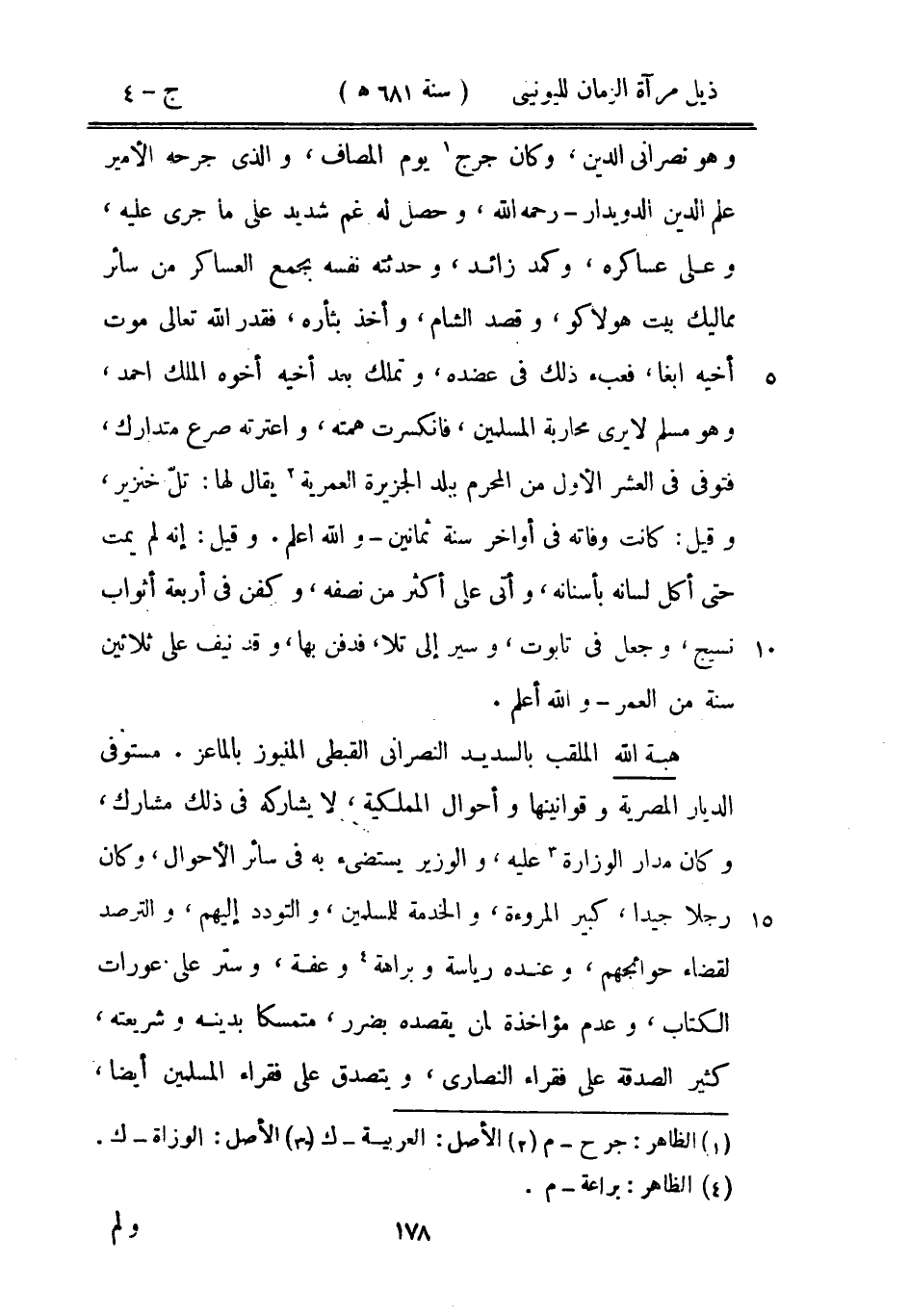 وهو نصراني الدين، وكان جرح يوم المصاف، والذي جرحه الأمير علم الدين الدويدار رحمه الله، وحصل له غم شديد على ما جرى عليه، وعلى عساكره، وكمد زائد، وحدثته نفسه بجمع العساكر من سائر مماليك بيت هولاكو، وقصد الشام، وأخذ بثأره، فقدر الله تعالى موت أخيه ابغا، فعبء ذلك في عضده، وتملك بعد أخيه أخوه الملك أحمد، وهو مسلم لا يرى محاربه المسلمين، فانكسرت همته، واعترته صرع متدارك، فتوفى في العشر الأول من المحرم ببلد الجزيرة العمرية يقال لها: تل خنزير، وقيل: كانت وفاته في آواخر سنة ثمانين والله أعلم وقيل: انه لم يمت حتى أكل لسانه بأسنانه، وأتى على أكثر من نصفه، وكفن في أربعة أثواب نسيج، وجعل في تابوت، وسير إلى تلا، فدفن بها، وقد نيف على ثلاثين سنة من العمر والله أعلم.