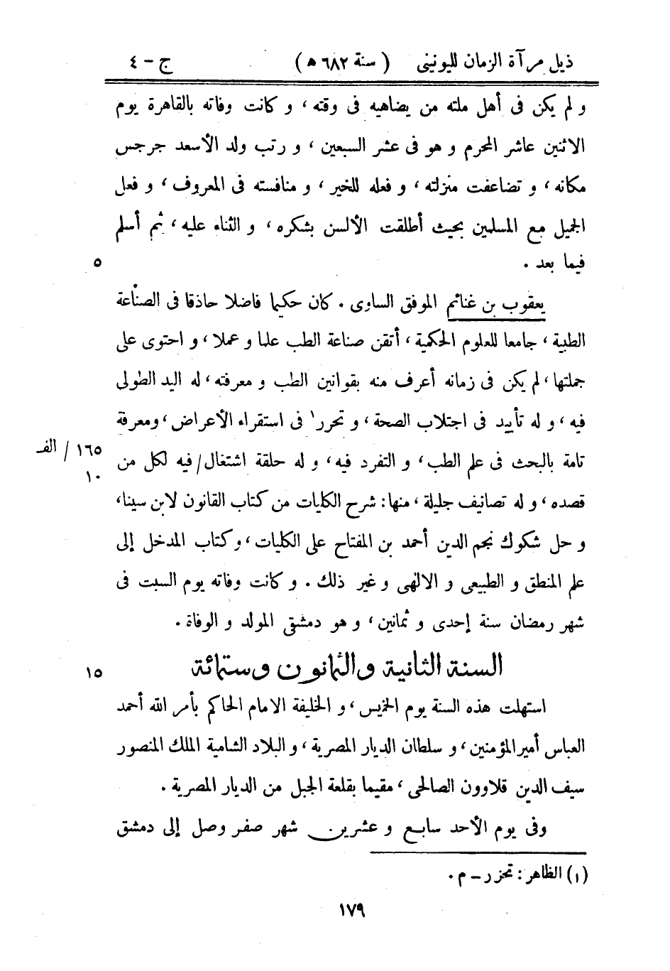 يعقوب بن غنائم الموفق الساوى. كان حكيماً فاضلاً حاذقاً في الصناعة الطبية، جامعاً للعلوم الحكمية، أتقن صناعة الطب علماً وعملاً، واحتوى على جملتها، لم يكن في زمانه أعرف منه بقوانين الطب ومعرفته، له اليد الطولى فيه، وله تأييد في اجتلاب الصحة، وتحرر في استقراء الأعراض، ومعرفة تامة بالبحث في علم الطب، والتفرد فيه، وله حلقة اشتغال فيه لكل من قصده، وله تصانيف جليلة، منها: شرح الكليات من كتاب القانون لابن سينا، وحل شكوك نجم الدين أحمد بن المفتاح على الكليات، وكتاب المدخل إلى علم المنطق والطبيعي والالهي وغير ذلك، وكانت وفاته يوم السبت في شهر رمضان سنة إحدى وثمانين، وهو دمشقي المولد والوفاة.