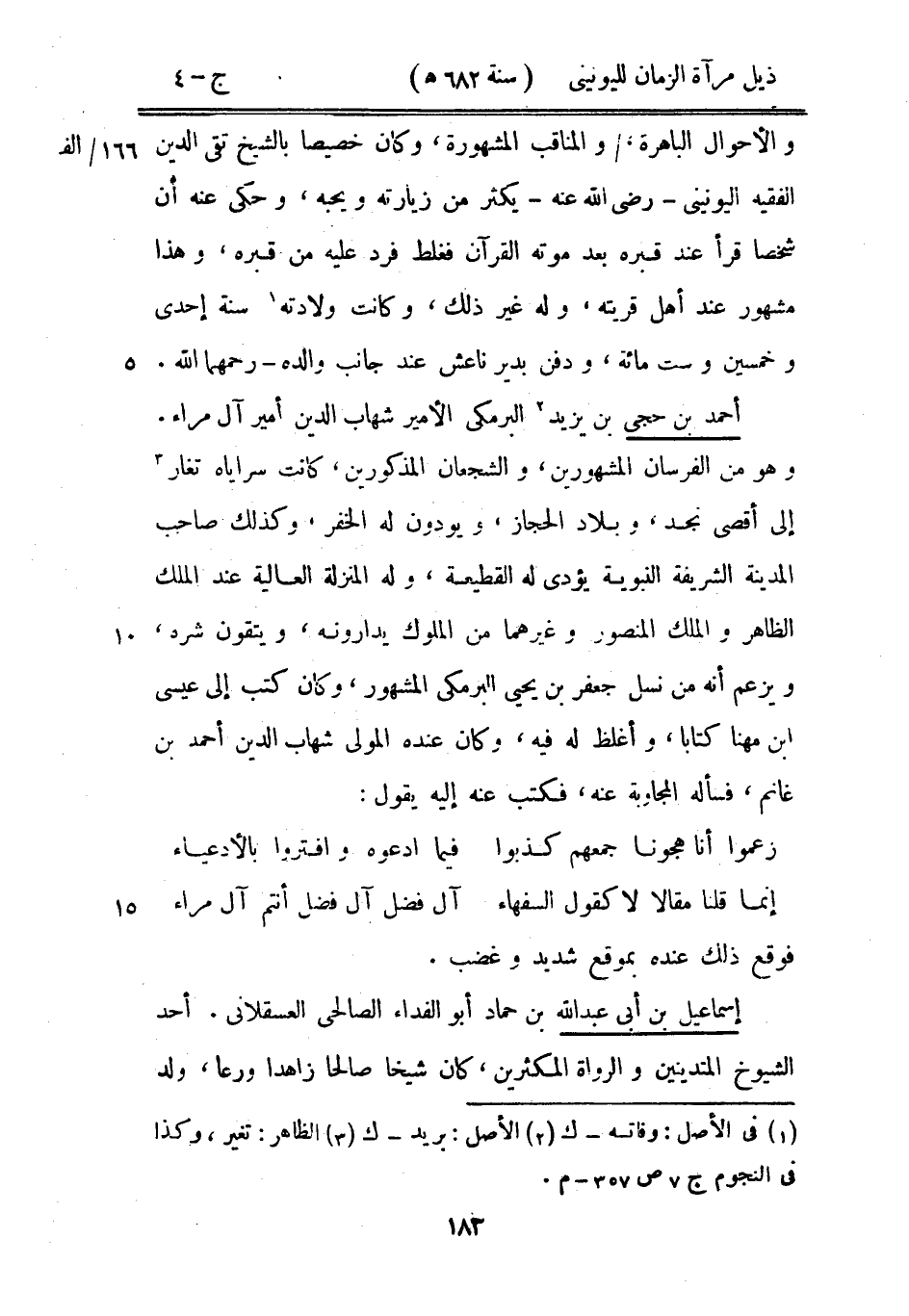 والأحوال الباهرة، والمناقب المشهورة، وكان خصيصاً بالشيخ تقي الدين الفقيه اليونيني رضي الله عنه يكثر من زيارته ويحبه، وحكى عنه أن شخصاً قرأ عند قبره بعد موته القرآن فغلط فرد عليه من قبره، وهذا مشهور عند أهل قريته، وله غير ذلك، وكانت ولادته سنة إحدى وخمسين وست مائة، ودفن بدير ناعش عند جانب والده رحمهما الله.