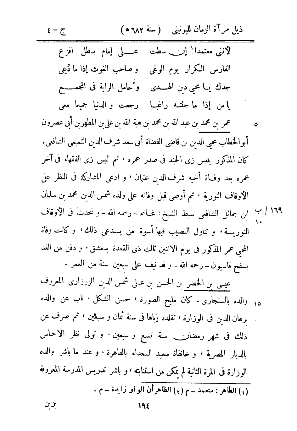 عمر بن محمد بن عبد الله بن محمد بن هبة الله بن علي بن المطهر بن أبي عصرون أبو الخطاب محي الدين بن قاضي القضاة أبي سعد شرف الدين التميمي الشافعي، كان المذكور يلبس زي الجند في صدر عمره، ثم لبس زي الفقهاء في آخر عمره بعد وفاة أخيه شرف الدين عثمان، وادعى المشاركة في النظر على الأوقاف النورية، ثم أوصى قبل وفاته على ولده شمس الدين محمد بن سلمان ابن جمائل الشافعي سبط الشيخ غانم رحمه الله وتحدث في الأوقاف النورية، وتناول النصيب فيها أسوة من يدعى ذلك، وكانت وفاة المحي عمر المذكور في يوم الاثنين ثالث ذى القعدة بدمشق، ودفن من الغد بسفح قاسيون رحمه الله وقد نيف على سبعين سنة من العمر.