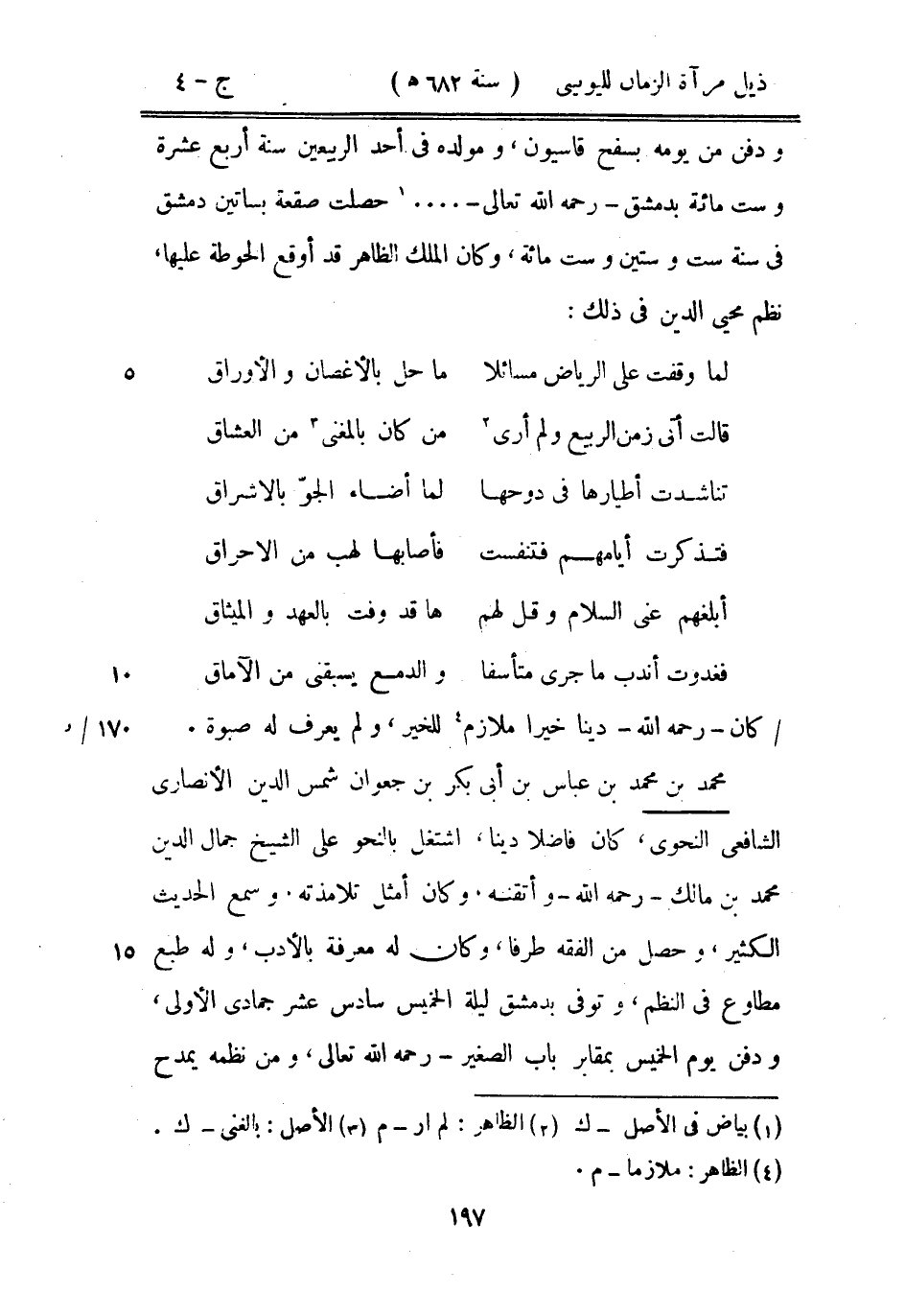 ودفن من يومه بسفح قاسيون، ومولده في أحد الربيعين سنة أربع عشرة وست مائة بدمشق رحمه الله تعالى.... حصلت صعقة بساتين دمشق في سنة ست وستين وست مائة، وكان الملك الظاهر قد أوقع الحوطة عليها، نظم محي الدين في ذلك: