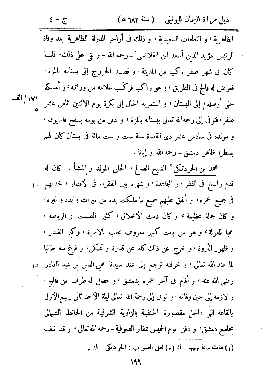 محمد بن الحردتكي الشيخ الصالح، الحلبي المولد والمنشأ. كان له قدم راسخ في الفقر، والمجاهدة، وشهرة بين الفقراء في الأقطار، خدمهم في جميع عمره، وأنفق عليهم جميع ما ملكت يده من ميراث والده وغيره، وكان جملة عظيمة، وكان دمث الأخلاق، كثير الصمت والرياضة، محباً للعزلة، وهو من بيت كبير معروف بحلب بالامرة، وكبر القدر، وظهور الثروة. وخرج عن ذلك كله عن قدرة وتمكن، وفرغ منه طالباً لما عند الله تعالى، وخرقته ترجع إلى عند سيدنا محي الدين بن عبد القادر رضي الله عنه، وأقام في آخر عمره بدمشق، وحصل له طرف من فالج، ولازمه إلى حين وفاته، وتوفى إلى رحمة الله تعالى ليلة الأحد ثاني ربيع الأول بالقاعة التي داخل مقصورة الحنفية بالزاوية الشرقية من الحائط الشمالي بجامع دمشق، ودفن يوم الخميس بمقابر الصوفية رحمه الله تعالى، وقد نيف