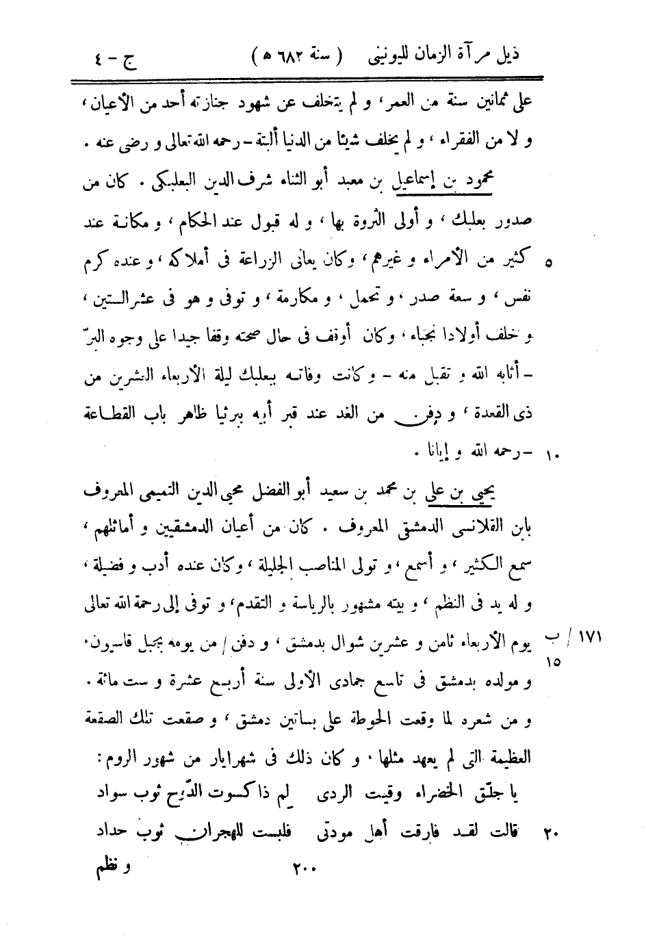 محمود بن إسماعيل بن معبد أبو الثناء شرف الدين البعلبكي. كان من صدور بعلبك، وأولى الثروة بها، وله قبول عند الحكام، ومكانة عند كثير من الأمراء وغيرهم، وكان يعاني الزراعة في أملاكه، وعنده كرم نفس، وسعة صدر، وتحمل، ومكارمة، وتوفى وهو في عشر الستين، وخلف أولاد نجباء، وكان أوقف في حال صحته وقفاً جيداً على وجوه البر أثابه الله وتقبل منه وكانت وفاته ببعلبك ليلة الأربعاء العشرين من ذى القعدة، ودفن من الغد عند قبر أبيه برثيا ظاهر باب القطاعة رحمه الله وإيانا.