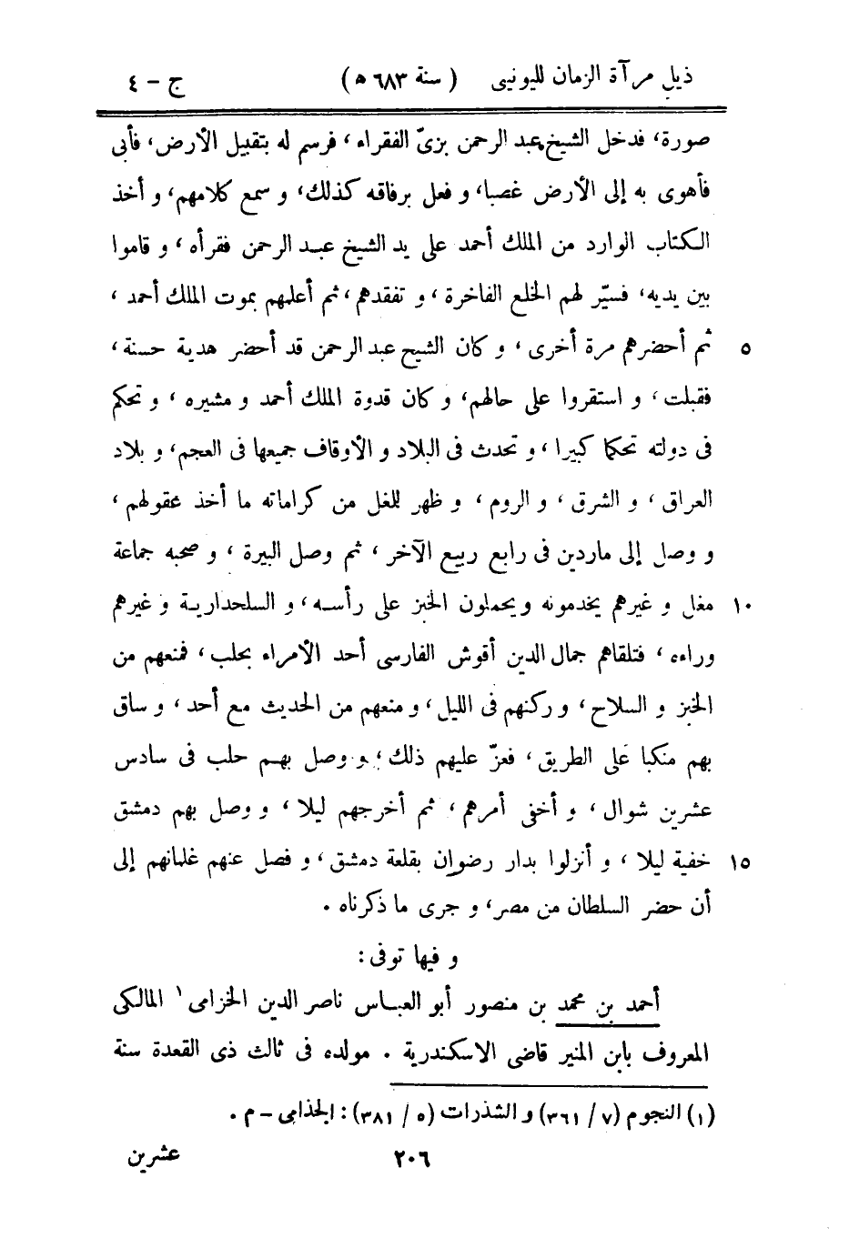 صورة، فدخل الشيخ عبد الرحمن بزي الفقراء، فرسم له بتقبيل الأرض، فأبى فأهوى به إلى الأرض غصباً، وفعل برفاقه كذلك، وسمع كلامهم، أخذ الكتاب الوارد من الملك أحمد على يد الشيخ عبد الرحمن فقرأه، وقاموا بين يديه، فسير لهم الخلع الفاخرة، وتفقدهم، ثم أعلمهم بموت الملك أحمد، ثم أحضرهم مرة أخرى، وكان الشيخ عبد الرحمن قد أحضر هدية حسنة، فقبلت، واستقروا على حالهم، وكان قدوة الملك أحمد ومشيره، وتحكم في دولته تحكماً كبيراً، وتحدث في البلاد والأوقاف جميعها في العجم، وبلاد العراق، والشرق، والروم، وظهر للمغل من كراماته ما أخذ عقولهم، ووصل إلى ماردين في رابع ربيع الآخر، ثم وصل البيرة، وصحبه جماعة مغل وغيرهم يخدمونه ويحملون الخبز على رأسه، والسلحدارية وغيرهم وراءه، فتلقاهم جمال الدين أقوش الفارسي أحد الأمراء بحلب، فمنعهم من الخبز والسلاح، وركنهم في الليل، ومنعهم من الحديث مع أحد، وساق بهم منكباً على الطريق، فعز عليهم ذلك، ووصل بهم حلب في سادس عشرن شوال، وأخفى أمرهم، ثم أخرجهم ليلاً، ووصل بهم دمشق خفية ليلاً، وأنزلوا بدار رضوان بقلعة دمشق، وفصل عنهم غلمانهم إلى أن حضر السلطان من مصر، وجرى ما ذكرناه.
