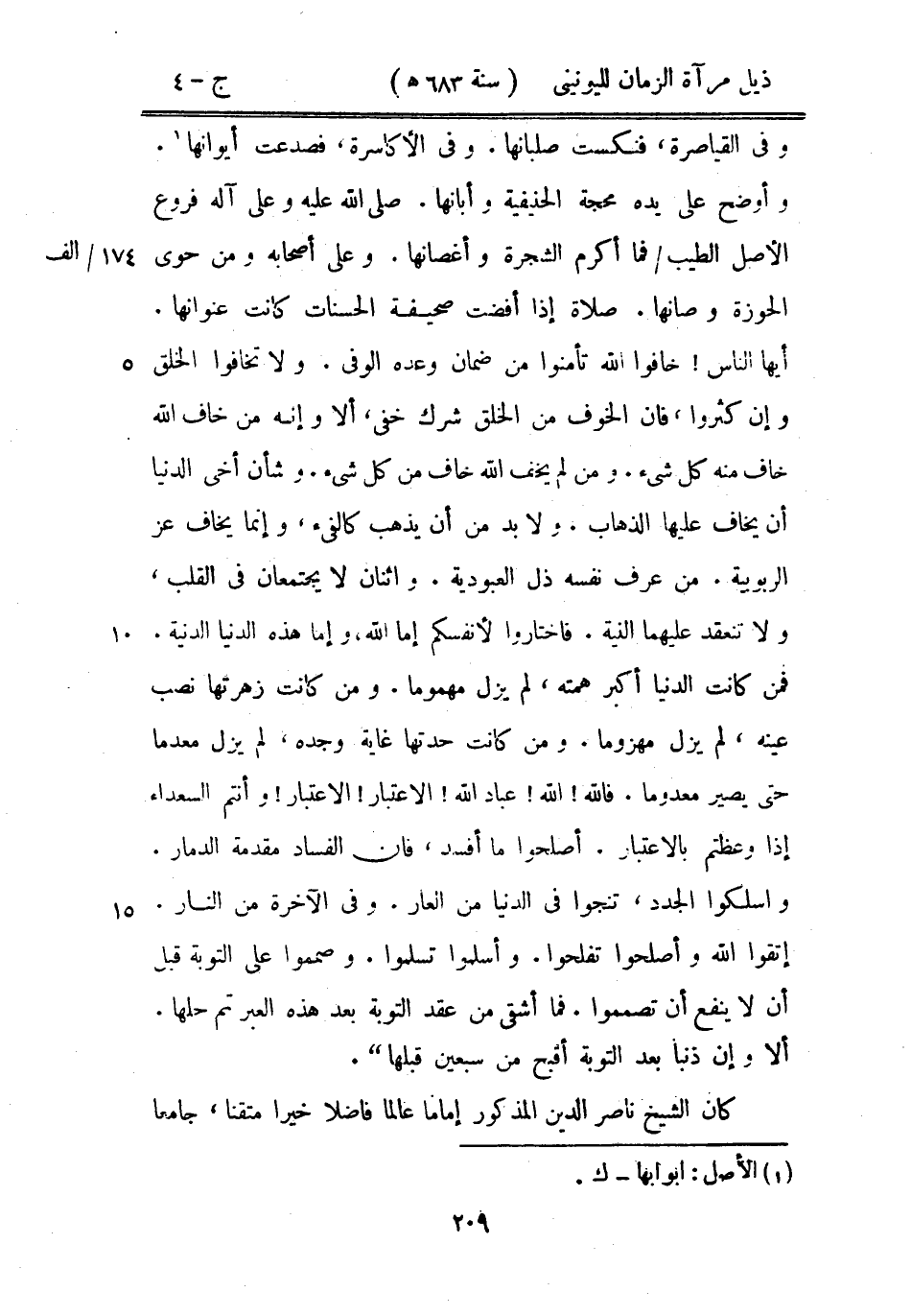 القياصرة، فنكست صلبانها. وفي الأكاسرة، فصدعت أيوانها. وأوضح على يده محجة الحنيفية وأبانها. صلى الله عليه وعلى آله فروع الأصل الطيب فما أكرم الشجرة وأغصانها. وعلى أصحابه ومن حوى الحوزة وصانها. صلاة إذا أفضت صحيفة الحسنات كانت عنوانها. أيها الناس! خافوا الله تأمنوا من ضمان وعده الوفي. ولا تخافوا الخلق وإن كثروا، فإن الخوف من الخلق شرك خفي، ألا وإنه من خاف الله خاف منه كل شيء. ومن لم يخف الله خاف من كل شيء. وشأن أخي الدنيا أن يخاف عليها الذهاب. ولابد من أن يذهب كالفئ، وإنما يخاف عز الربوبية. من عرف نفسه ذل العبودية. واثنان لا يجتمعان في القلب، ولا تنعقد عليهما النية، فاختاروا لأنفسهم إما الله، وإما هذه الدنيا الدنية. فمن كانت الدنيا أكبر همته، لم يزل مهموماً. ومن كانت زهرتها نصب عينه، لم يزل مهزوماً. ومن كانت حدتها غاية وجده، ولم يزل معدماً حتى يصير معدوماً. فالله! الله! عباد الله! الاعتبار! الاعتبار! وأنتم السعداء إذا وعظتم بالاعتبار. أصلحوا ما أفسد، فإن الفساد مقدمة الدمار. إتقوا الله وأصلحوا تفلحوا. وأسلموا تسلموا. وصمموا على التوبة قبل أن لا ينفع أن تصمموا. فما أشقى من عقد التوبة بعد هذه العبر تم حلها. ألا وإن ذنباً بعد التوبة أقبح من سبعين قبلها ".
