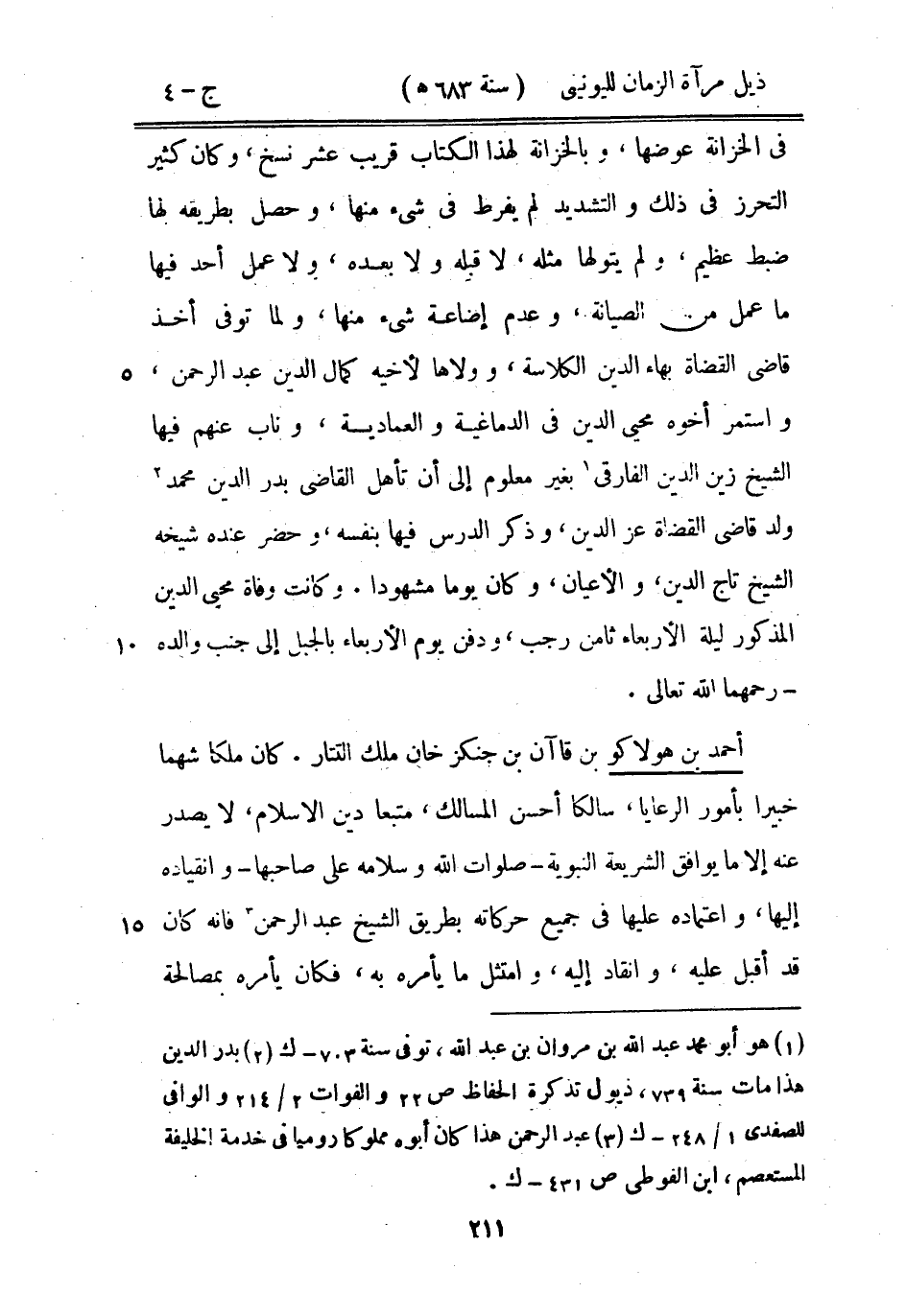 أحمد بن هولاكو بن قاآن بن جنكز خان ملك التتار. كان ملكاً شهماً خبيراً بأمور الرعايا، سالكاً أحسن المسالك، متبعاً دين الاسلام، لا يصدر عنه إلا ما يوافق الشريعة النبوية صلوات الله وسلامه على صاحبها وانقياده إليها، واعتماده عليها في جميع حركاته بطريق الشيخ عبد الرحمن فإنه كان قد أقبل عليه، وانقاد إليه، وامتثل ما يأمره به، فكان يأمره بمصالحة