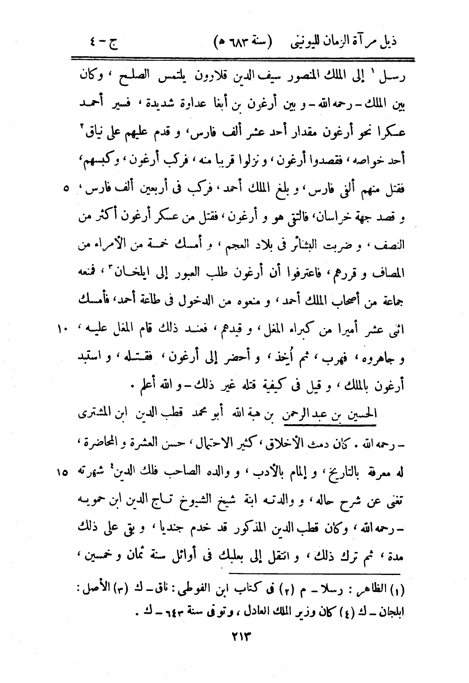 الحسين بن عبد الرحمن بن هبة الله أبو محمد قطب الدين ابن المشترى رحمه الله. كان دمث الأخلااق، كثير الاحتمال، حسن العشرة والمحاضرة، له معرفة بالتاريخ، وإلمام بالأدب، ووالده الصاحب فلك الدين شهرته تغنى عن شرح حاله، ووالدته ابنة شيخ الشيخوخ تاج الدين ابن حمويه رحمه الله وكان قطب الدين المذكور قد خدم جندياً، وبقي على ذلك مدة، ثم ترك ذلك، وانتقل إلى بعلبك في أوائل سنة ثمان وخمسين،