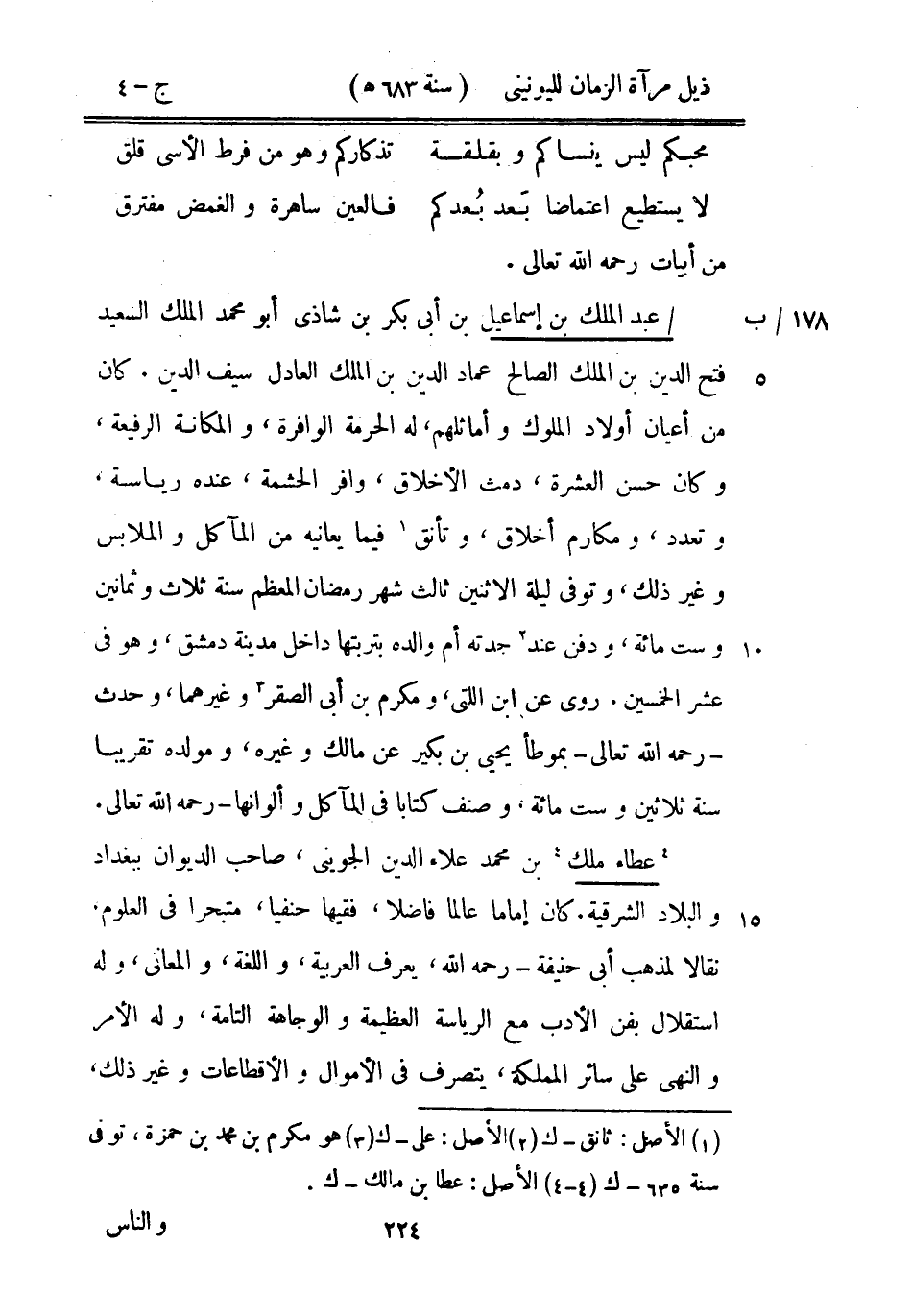 عطاء ملك بن محمد علاء الدين الجويني، صاحب الديوان ببغداد والبلاد الشرقية. كان إماماً عالماً فاضلاً، فقيهاً حنفياً، متبحراً في العلوم. نقالاً لمذهب أبي حنيفة رحمه الله، يعرف العربية، واللغة، والمعاني، وله استقلال بفن الأدب مع الرياسة العظيمة والوجاهة التامة، وله الأمر والنهي على سائر المملكة، يتصرف في الأموال والأقطاعات وغير ذلك،