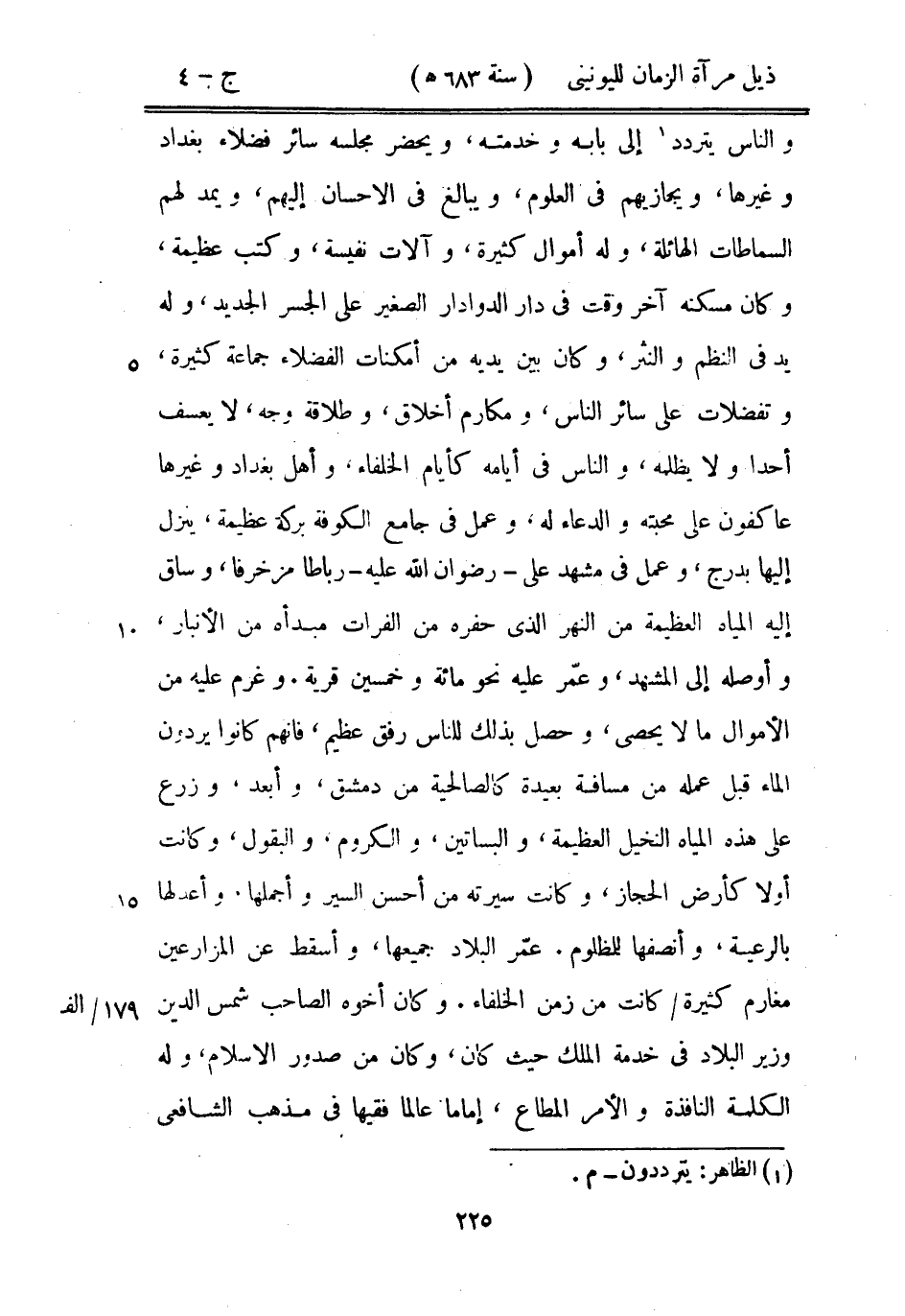 والناس يتردد إلى بابه وخدمته، ويحضر مجلسه فضلاء بغداد وغيرها، ويجازيهم في العلوم، ويبالغ في الاحسان إليهم، ويمد لهم السماطات الهائلة، وله أموال كثيرة، وآلات نفيسة، وكتب عظيمة، وكان مسكنه آخر وقت في دار الدوادار الصغير على الجسر الجديد، وله يد في النظم والنثر، وكان بين يديه من أمكانات الفضلاء جماعة كثيرة، وتفضلات على سائر الناس، ومكارم أخلاق، وطلاقة وجه، لا يعسف أحداً ولا يظلمه، والناس في أيامه كأيام الخلفاء، وأهل بغداد وغيرها عاكفون على محبته والدعاء له، وعمل في جامع الكوفة بركة عظيمة، ينزل إليها بدرج، وعمل مشهد على رضوان الله عليه رباطاً مزخرفاً، وساق إليه المياه العظيمة من النهر الذي حفره من الفرات مبدأه من الأنبار، وأوصله إلى المشهد، وعمر عليه نحو مائة وخمسين قرية. وغرم عليه من الأموال ما لا يحصى، وحصل بذلك للناس رفق عظيم، فإنهم كانوا يردون الماء قبل عمله من مسافة بعيدة كالصالحية من دمشق، وأبعد، وزرع على هذه المياه النخيل العظيمة، والبساتين، والكروم، والبقول، وكانت أولاً كأرض الحجاز، وكانت سيرته من أحسن السير وأجملها. وأعدلها بالرعية، وأنصفها للمظلوم. عمر البلاد جميعها، وأسقط عن المزارعين مغارم كثيرة كانت من زمن الخلفاء. وكان أخوه الصاحب شمس الدين وزير البلاد في خدمة الملك حيث كان، وكان من صدور الاسلام، وله الكلمة النافذة والأمر المطاع، إماماً عالماً فقيهاً في مذهب الشافعي