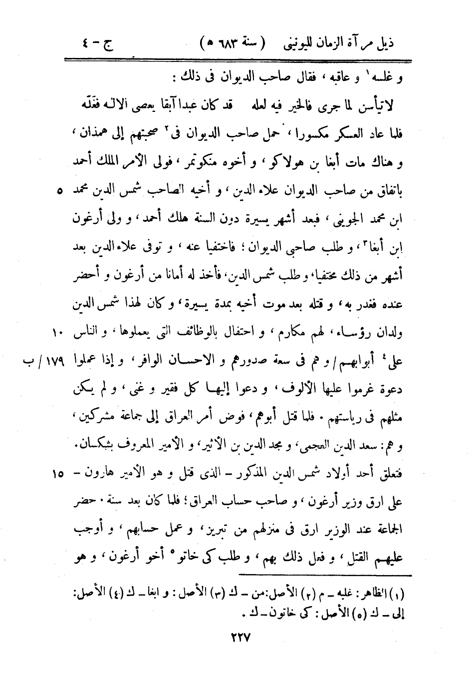فلما عاد العسكر مكسوراً، حمل صاحب الديوان في صحبتهم إلى همذان، وهناك مات أبغا بن هولاكو، وأخوه منكوتمر، فولى الأمر الملك أحمد باتفاق من صاحب الديوان علاء الدين، وأخيه الصاحب شمس الدين محمد ابن محمد الجوينى، فبعد أشهر يسيرة دون السنة هلك أحمد، وولى أرغون ابن أبغا، وطلب صاحبي الديوان؛ فاختفيا عنه، وتوفى علاء الدين بعد أشهر من ذلك مختفياً، وطلب شمس الدين، فأخذ له أماناً من أرغون وأحضر عنده فغدر به، وقتله بعد موت أخيه بمدة يسيرة، وكان لهذا شمس الدين ولدان رؤساء، لهم مكارم، واحتفال بالوظائف التي يعملوها. والناس على أبوابهم وهم في سعة صدورهم والاحسان الوافر، وإذا عملوا دعوة غرموا عليها الألوف، ودعوا إليها كل فقير وغني، ولم يكن مثلهم في رياستهم. فلما قتل أبوهم، فوض أمر العراق إلى جماعة مشركين، وهم: سعد الدين العجمي، ومجد الدين بن الأثير، والأمير المعروف بشكسان. فتعلق أحد أولاد شمس الدين المذكور الذي قتل وهو الأمير هارون على ارق وزير أرغون، وصاحب حساب العراق؛ فلما كان بعد سنة. حضر الجماعة عند الوزير ارق في منزلهم من تبريز، وعمل حسابهم، وأوجب عليهم القتل، وفعل ذلك بهم، وطلب كى خاتو أخو أرغون، وهو