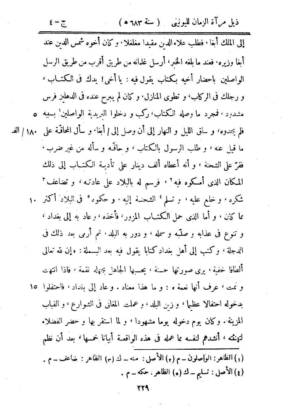 إلى الملك أبغا، فطلب علاء الدين مقيداً مغلغلاً، وكان أخوه شمس الدين عند أبغا وزيره، فعندما بلغه الخبر، أرسل غلمانه من طريق أقرب من طريق الرسل الواصلين بإحضار أخيه بكتاب يقول فيه: يا أخي! يدك في الكتاب، ورجلك في الركاب، وتطوى المنازل، وكان لم يبرح عنده في الدهليز فرس مشدود، فمجرد ما وصله الكتاب، ركب ودخلوا البريدية الواصلين بسببه فلم يجدوه، وساق الليل والنهار إلى أن وصل إلى أبغا، وسأل المحاقة على ما قيل عنه، وطلب الرسول بالكتاب، وحاقه وسأله من غير ضرب، فقر على الشحنة، وأنه أعطاه ألف دينار على تأدية الكتاب إلى ذلك المكان الذي أمسكوه فيه، فرسم له بالبلاد على عادته، وتضاعف شكره، وخلع عليه، وتسلم الشحنة إليه، وحكموه في البلاد أكثر مما كان، وأما الذي حمل الكتاب المزور، فأخذه، وعاد به إلى بغداد، وتنوع في عذابه وصلبه وسمله، ودور به البلد، ثم أرمى بعد ذلك في الدجلة، وكتب إلى أهل بغداد كتاباً يقول فيه بعد البسملة: " إن لله تعالى ألطافاً خفية، يرى صورتها حسنة، يحسبها الجاهل بجهله نقمة، فإذا انتهت ونمت، عرف أنها نعمة "؛ وما هذا معناه. وعاد إلى بغداد، فاحتفلوا بدخوله احتفالاً عظيماً، وزين البلد، وعملت المغاني في الشوارع، والقباب المزينة. وكان يوم دخوله يوماً مشهوداً، ولما استقر بها وحضر الفضلاء لتهنئته، أنشدهم لنفسه مما عمله في هذه الواقعة أبياتاً خمسها، بعد أن نظم