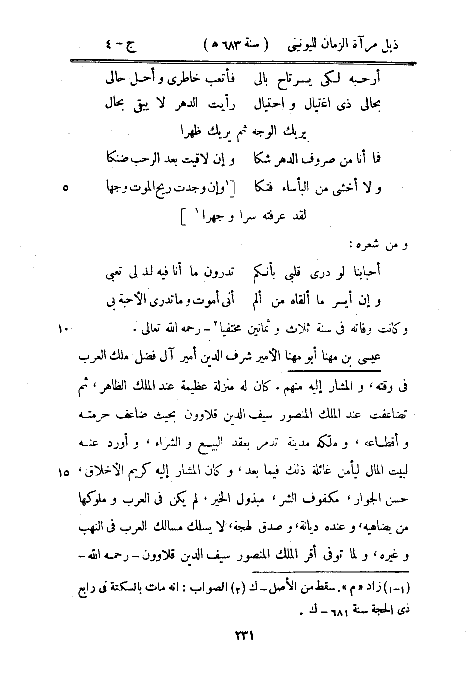عيسى بن مهنا أبو مهنا الأمير شرف الدين أمير آل فضل العرب في وقته، والمشار إليه منهم. كان له منزلة عظيمة عند الملك الظاهر، ثم تضاعفت عند الملك المنصور سيف الدين قلاوون بحيث ضاعف حرمته وأقطاعه، وملكه مدينة تدمر بعقد البيع والشراء، وأورد عنه لبيت المال ليأمن غائلة ذلك فيما بعد، وكان المشار إليه كريم الأخلاق، حسن الجوار، مكفوف الشر، مبذول الخير، لم يكن في العرب وملوكها من يضاهيه، وعنده ديانة، وصدق لهجة، لا يسلك مسالك العرب في النهب وغيره، ولما توفى أقر الملك المنصور سيف الدين قلاوون رحمه الله