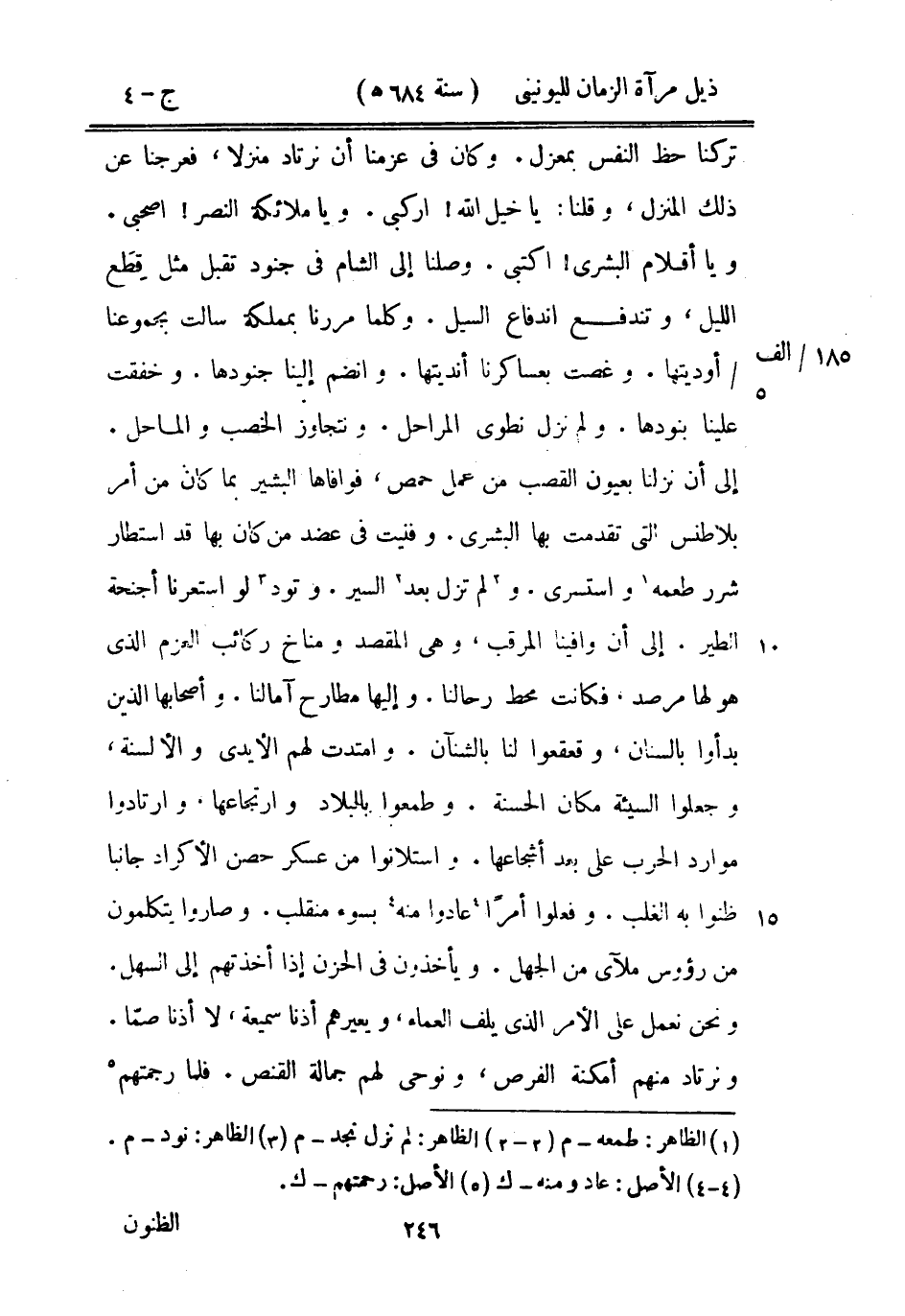 تركنا حظ النفس بمعزل. وكان في عزمنا أن نرتاد منزلاً، فعرجنا على ذلك المنزل، وقلنا: يا خيل الله! اركبي. ويا ملائكة النصر! اصحبي. ويا أقلام البشرى! اكتبي. وصلنا إلى الشام في جنود تقبل مثل قطع الليل، وتندفع اندفاع السيل. وكلما مررنا بمملكة سالت بجموعنا أوديتها. وغصت بعساكرنا أنديتها. وانضم إلينا جنودها. وخفقت علينا بنودها، ولم نزل نطوي المراحل. ونتجاوز الخصب والماحل. إلى أن نزلنا بعيون القصب من عمل حمص، فوافاها البشير بما كان من أمر بلاطنس التي تقدمت بها البشرى. وفنيت فيها عضد من كان بها قد استطار شرر طعمه واستسرى. ولم تزل بعد السير. وتود لو استعرنا أجنحة الطير. إلى أن وافينا المرقب، وهي المقصد ومناخ ركائب العزم الذي هو لها مرصد، فكانت محط رحالنا. وإليها مطارح آمالنا. وأصحابها الذين بدأوا بالسنان، وقعقعوا لنا بالشنآن. وامتدت لهم الأيدي والألسنة، وجعلوا السيئة مكان الحسنة. وطمعوا بالبلاد وارتجاعها، وارتادوا موارد الحرب على بعد أشجاعها. واستلانوا من عسكر حصن الأكراد جانباً ظنوا به الغلب. وفعلوا أمراً عادوا منه بسوء منقلب. وصاروا يتكلمون من رؤوس ملأى من الجهل. ويأخذون في الحزن إذا أخذتهم إلى السهل. ونحن نعمل على الأمر الذي يلف العماء، ويعيرهم أذناً سميعة، لا أذناً صماً. ونرتاد منهم أمكنة الفرص، ونوحي لهم جمالة القنص. فلما رجمتهم