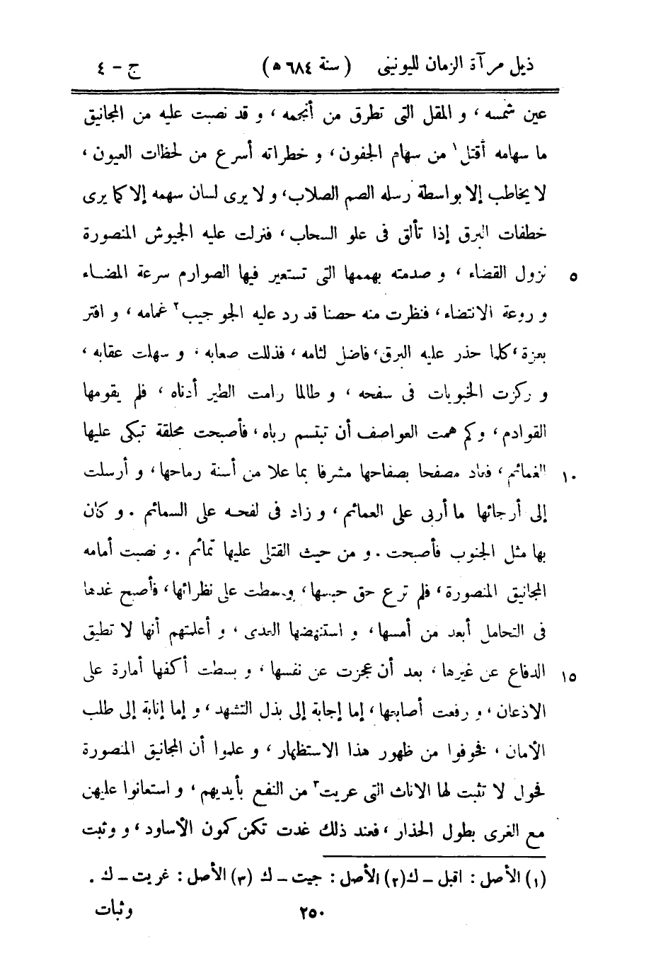 عين شمسه، والمقل التي تطرق من أنجمه، وقد نصبت عليه من المجانيق ما سهامه أقتل من سهام الجفون، وخطراته أسرع من لحظات العيون، لا يخاطب إلا بواسطة رسله الصم الصلاب، ولا يرى لسان سهمه إلا كما يرى خطفات البرق إذا تألق في علو السحاب، فنزلت عليه الجيوش المنصورة نزول القضاء، وصدمته بهممها التي تستعير فيها الصوارم سرعة لمضاء وروعة الانتضاء، فنظرت منا حصناً قد رد عليه الجو جيب غمامه، وافتر بعزة، كلما حذر عليه البرق، فاضل لثامه، فذللت صعابه، وسهلت عقابه، وركزت الخبويات في سفحه، وطالما رامت الطير أدناه، فلم يقومها القوادم، وكم همت العواصف أن تبتسم رباه، فأصبحت محلقة تبكي عليها الغمائم، فعاد مصفحاً بصفاحها مشرفا بما علا من أسنة رماحها، وأرسلت إلى أرجائها ما أربى على العمائم، وزاد في لفحه على السمائم. وكان بها مثل الجنوب فأصبحت. ومن حيث القتلى عليها تمائم. ونصبت أمامه المجانيق المنصورة، فلم ترع حق حسبها، وسطت على نظائرها، فأصبح غدها في التحامل أبعد من أمسها، واستنهضها العدى، وأعلمتهم أنها لا تطيق الدفاع عن غيرها، بعد أن عجزت عن نفسها، وبسطت أكفها أمارة على الإذعان، ورفعت أصابعها، إما إجابة إلى بذل التشهد، وإما إنابة إلى طلب الأمان، فخوفوا من ظهور هذا الاستظهار، وعلموا أن المجانيق المنصورة فحول لا تثبت لها الإناث التي عريت من النفع بأيديهم، واستعانوا عليهم مع الغرى بطول الحذار، فعند ذلك غدت تكمن كمون الأوساد، ووثبت